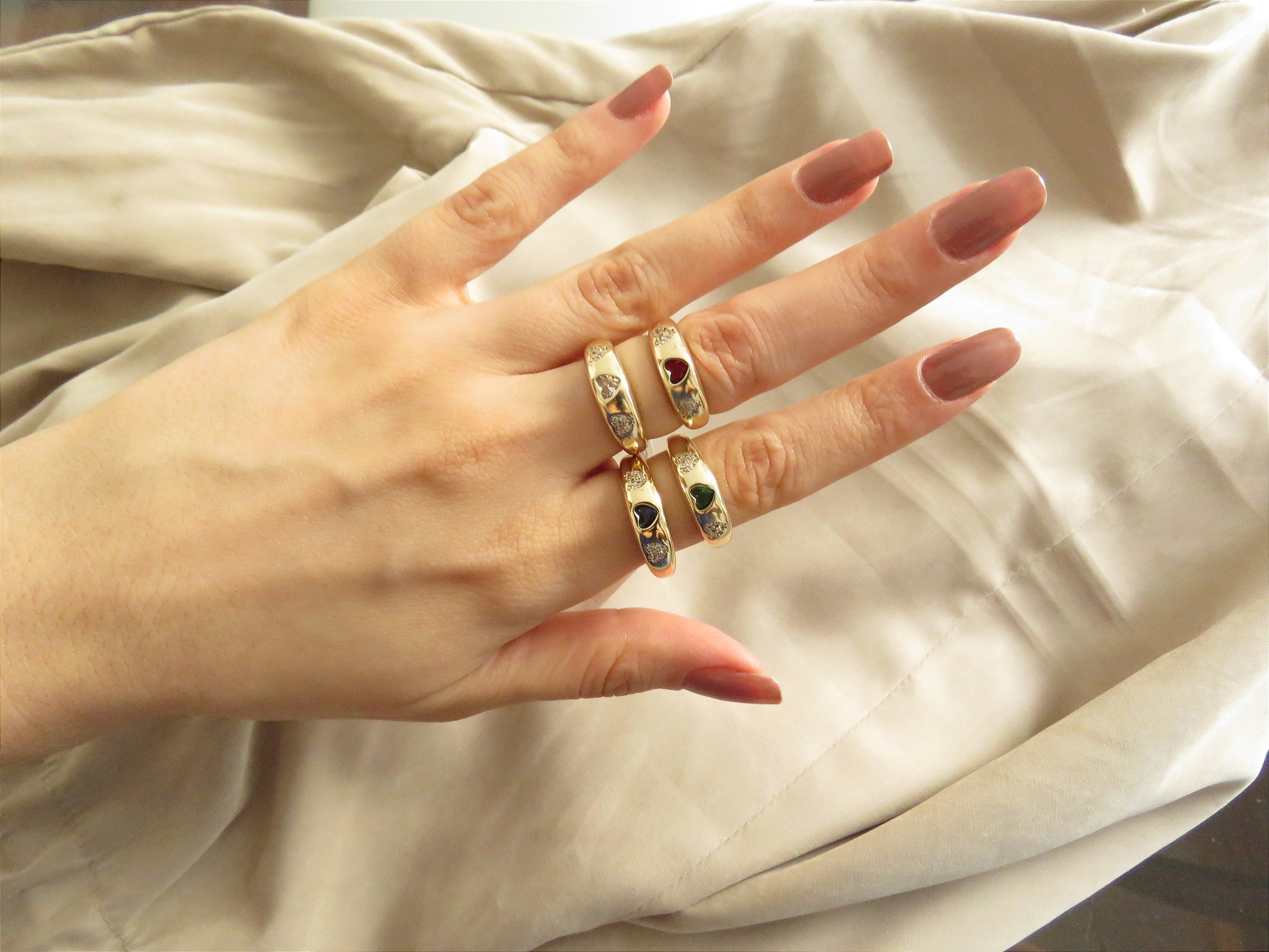 Anel abaulado com pedra em formato de coração ao centro, e corações cravejados .Banhado a ouro 18k.