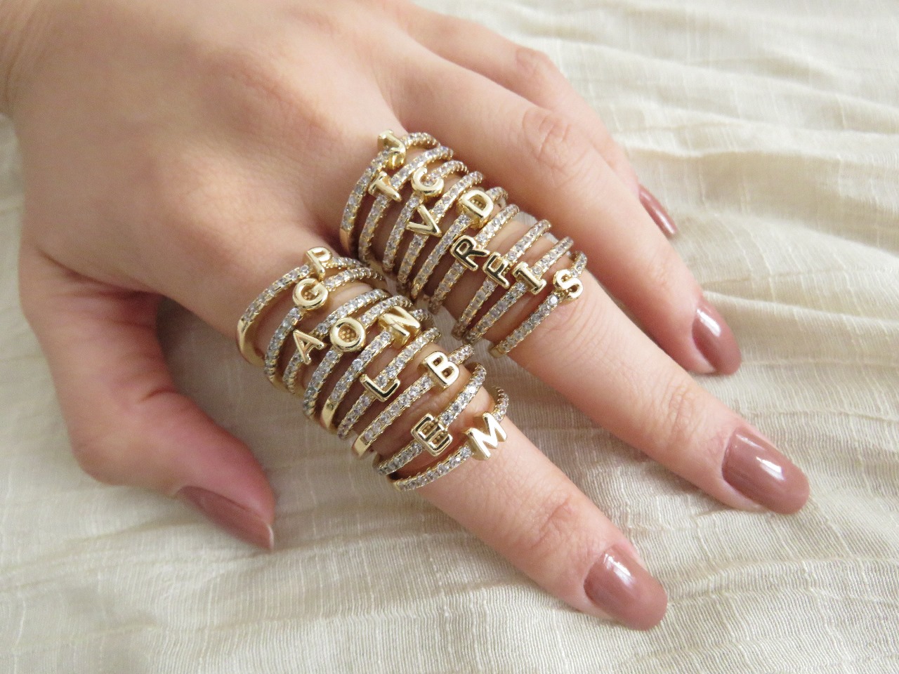 Anel com letra personalizada ao centro e zircônias cravejadas na lateral. Tamanho regulável. Banhado a ouro 18k.