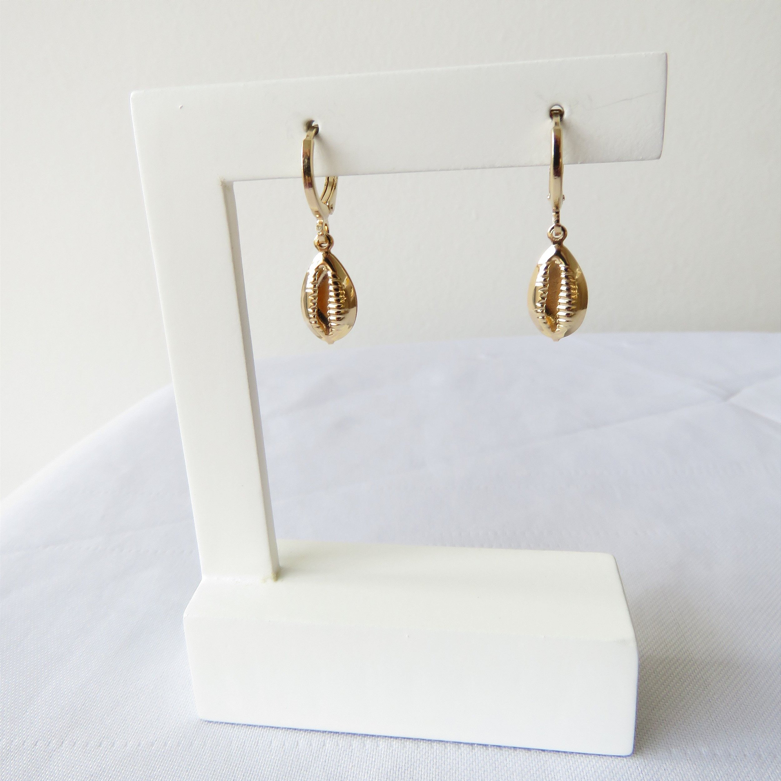 Brinco de argola com búzio pendurado. Fechamento clip. Banhado a ouro 18k.
