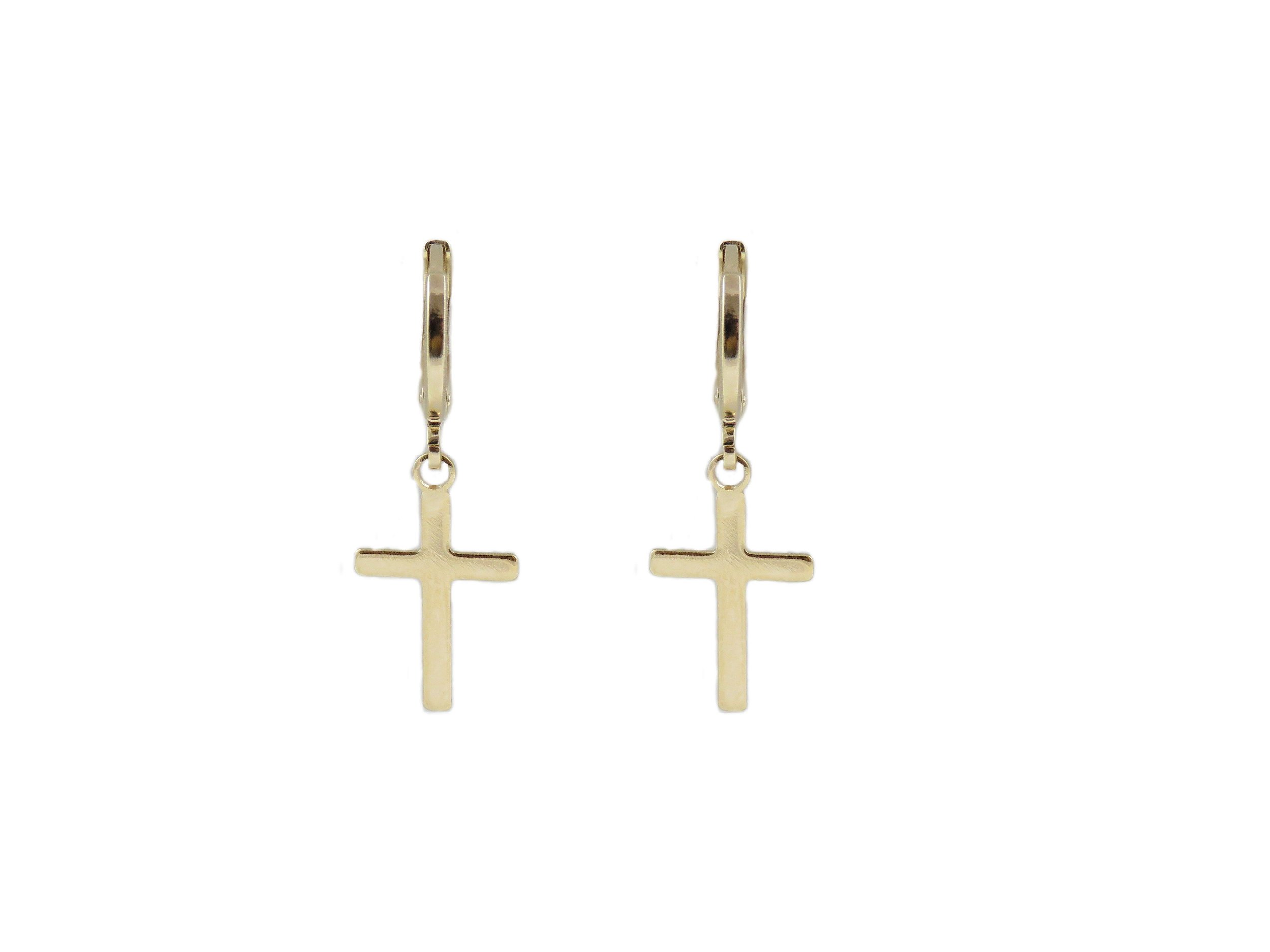 Brinco de argola com cruz pendurada. Fechamento clip. Banhado a ouro 18k. Hipoalergênico. Com 6 meses de garantia no banho