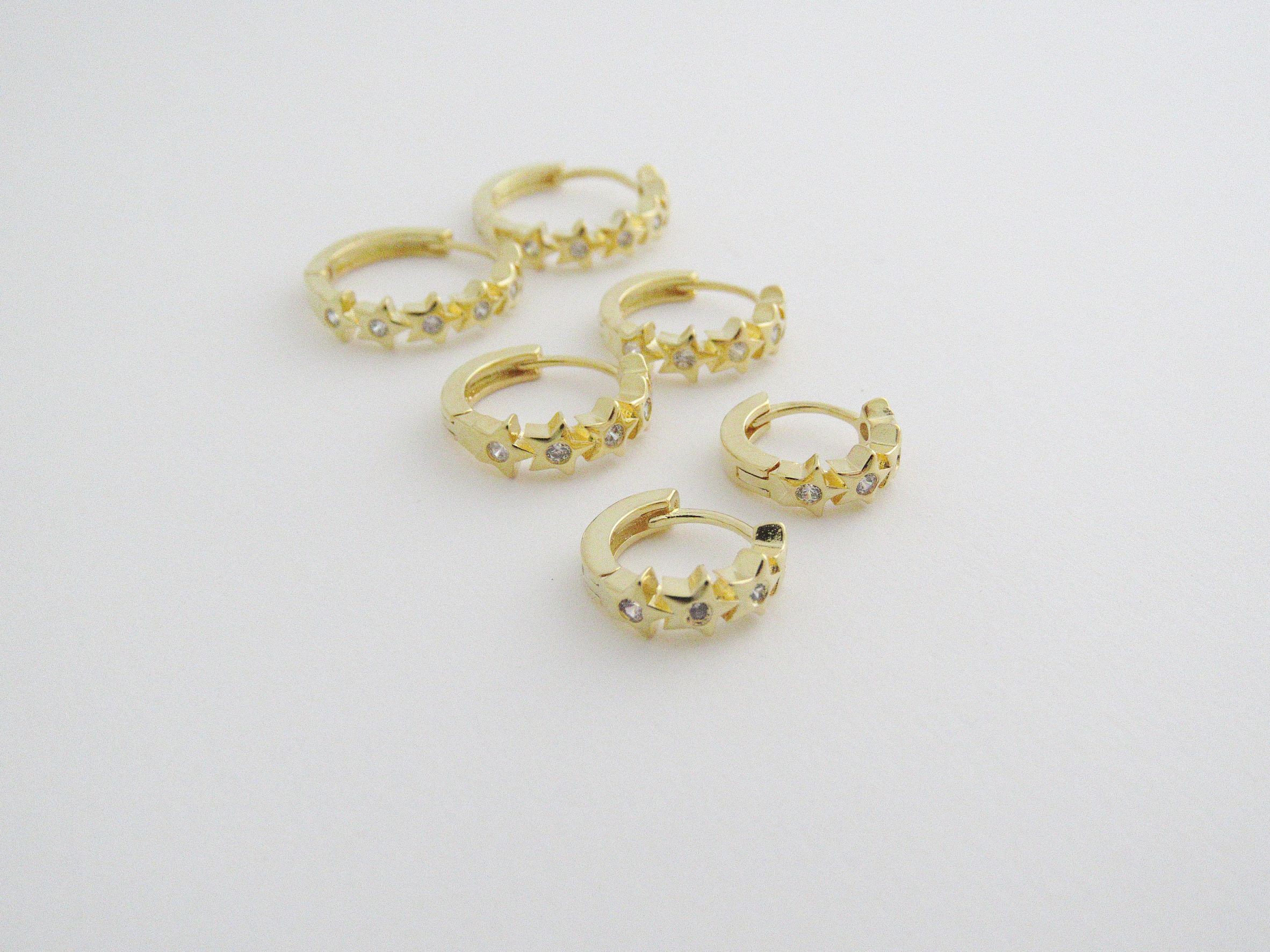 Brinco de argola em formato de estrelas, com zircônia ao centro. Disponível em três tamanhos. Fechamento click. Banhada a ouro 18k.