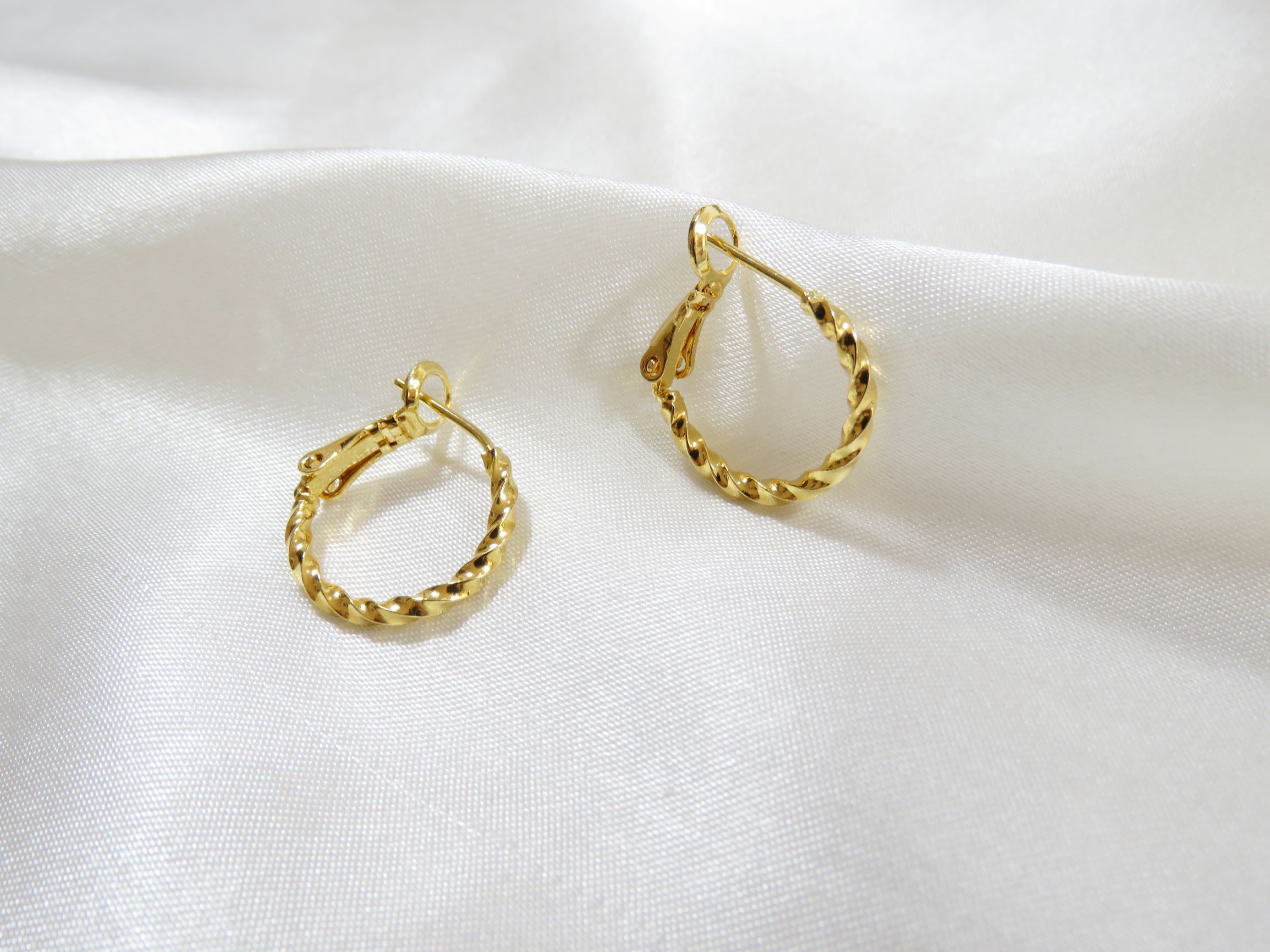 Brinco de argola fina retorcida. Fechamento clip. Banhado a ouro 18k.