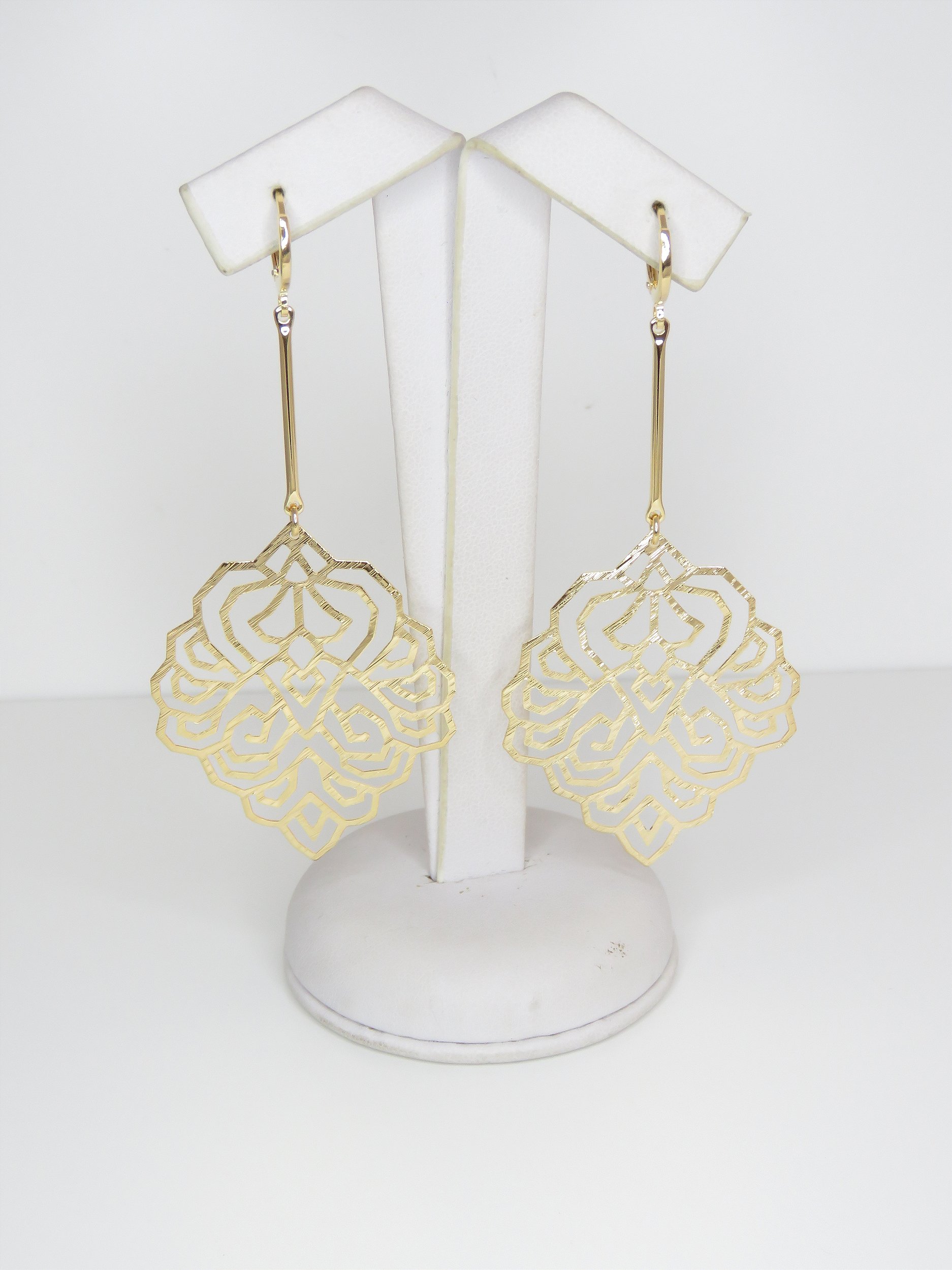 Brinco de argola com flor grande pendurada. Fechamento em click. Banhado a ouro 18k.