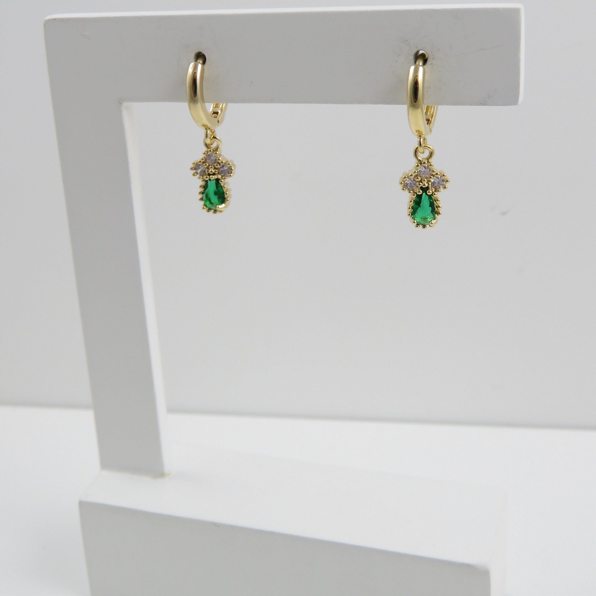 Brinco de argola com pedra em formato de gota com três zircônias. Fechamento clip. Banhado a ouro 18k.