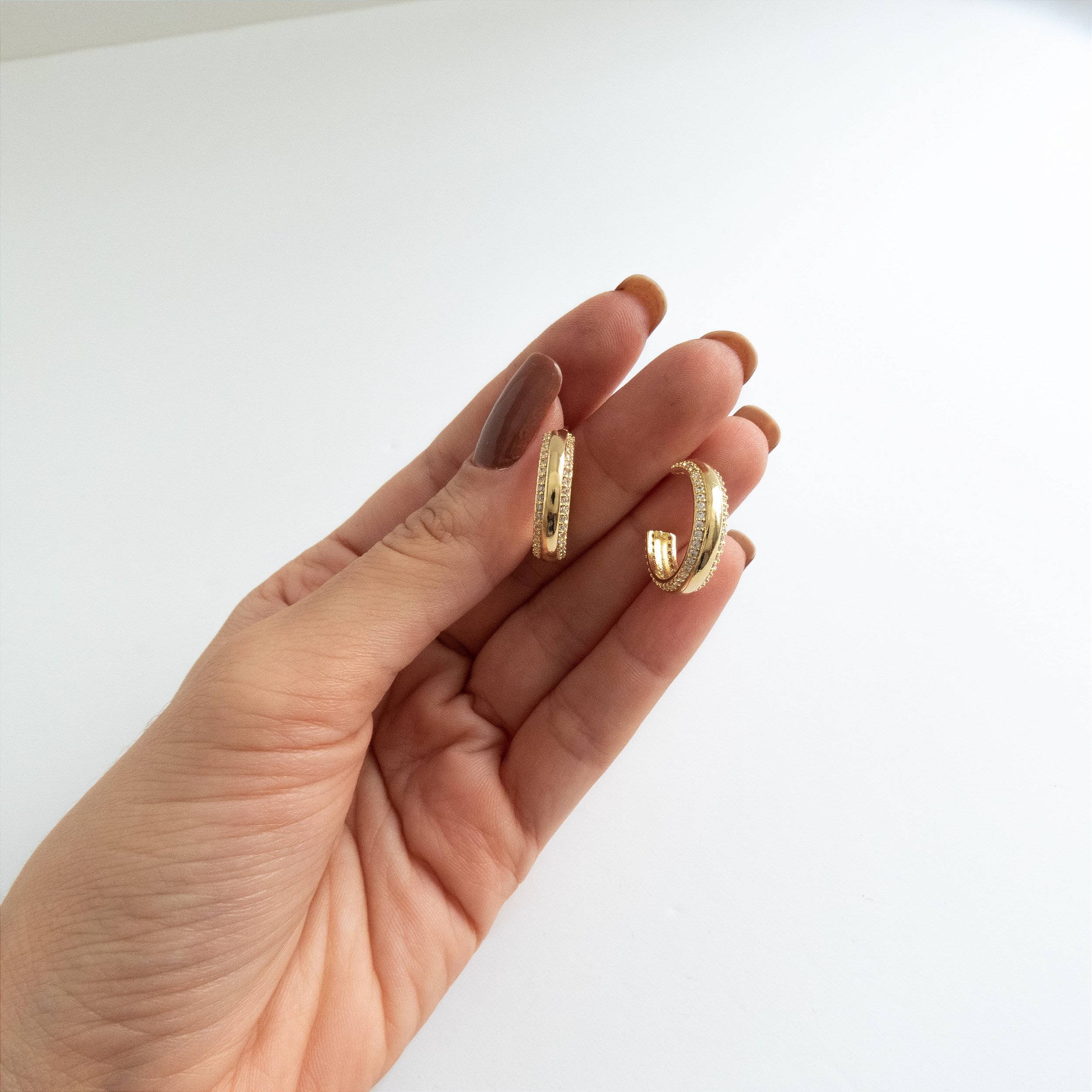 Brinco de argola com linha de zircônia nas laterais. Fechamento de pino e tarracha. Banhado a ouro 18k.