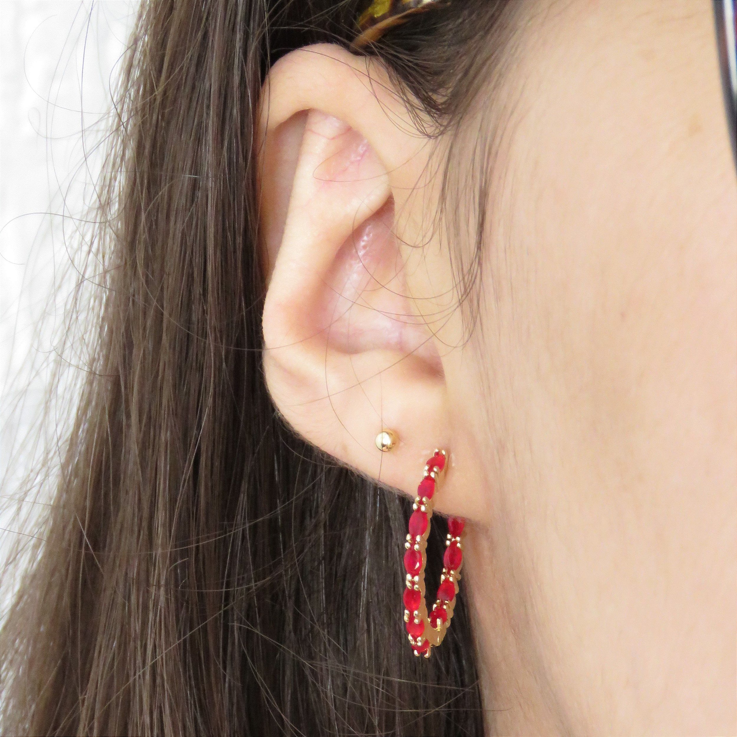 Brinco de argola pedras vermelhas dentro e fora. Fechamento em click. Banhado a ouro 18k.