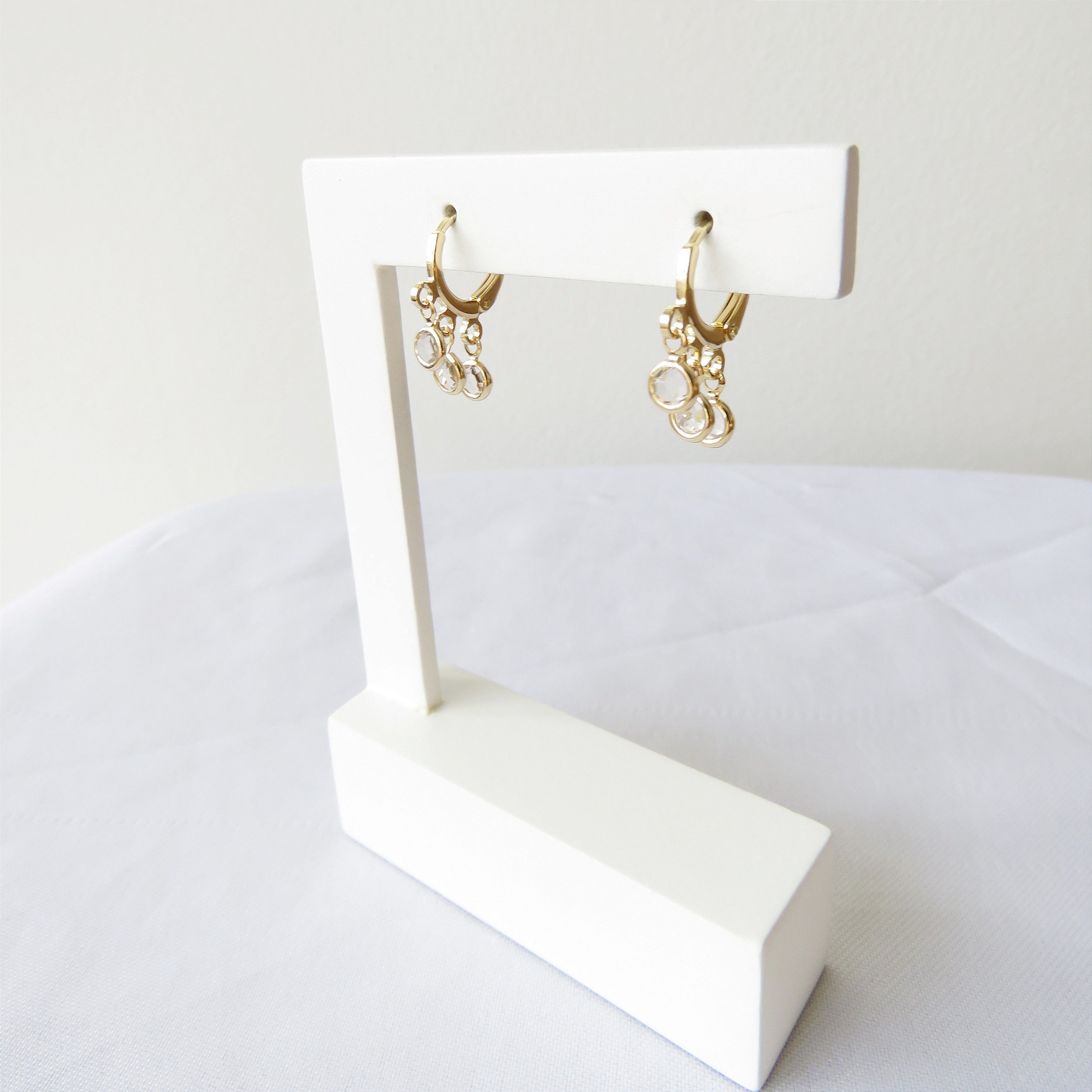 Brinco de argola com 3 zircônias penduradas. Fechamento clip. Banhado a ouro 18k.