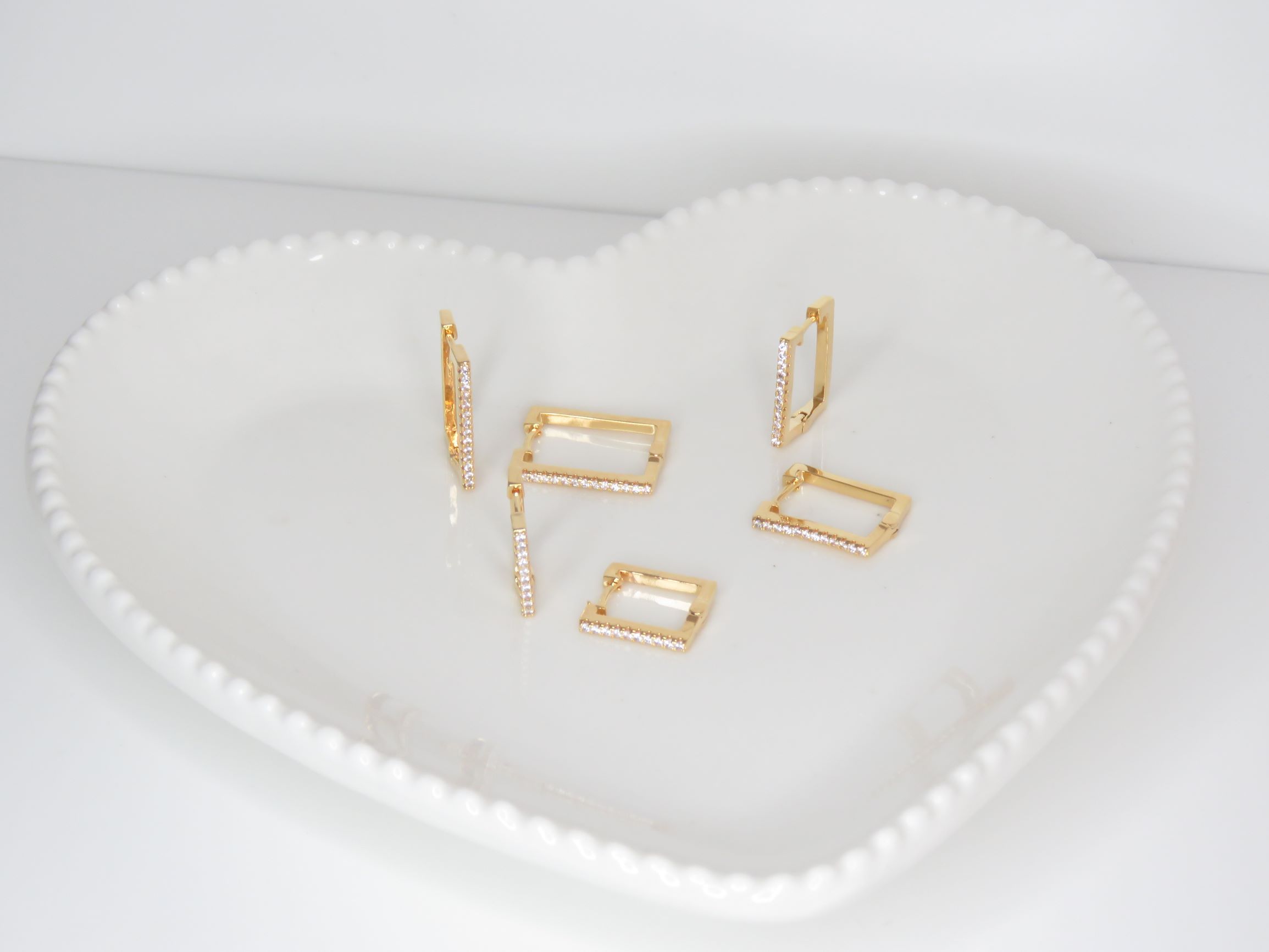 Brinco de argola em formato quadrado cravejado na zircônia. Disponível em três tamanhos. Fechamento em click. Banhado a ouro 18k.