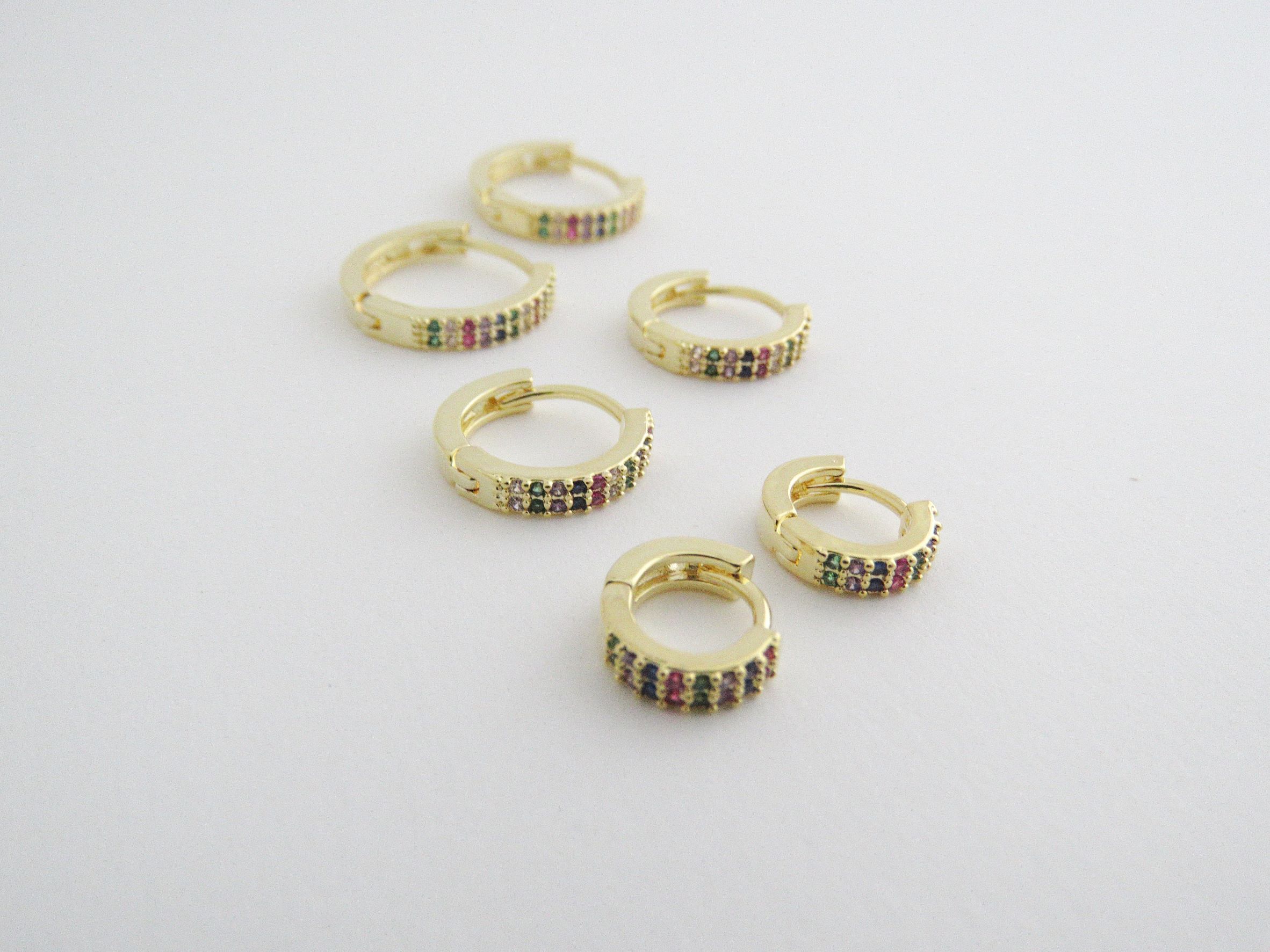 Brinco de argola cravejado na zircônia colorida. Disponível em três tamanhos. Fechamento em click. Banhado a ouro 18k.