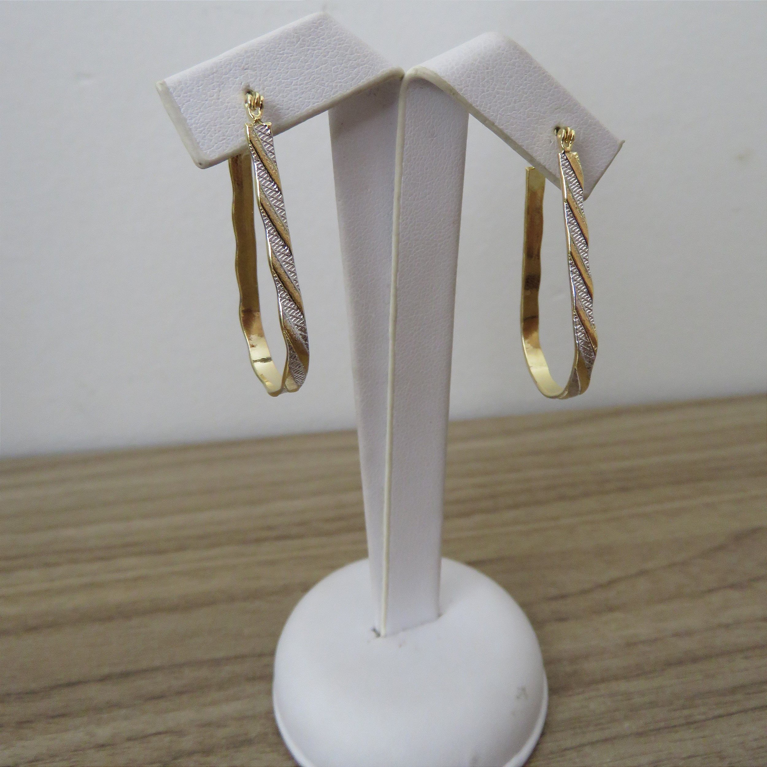 Brinco de argola em formato de U, com detalhes no ródio branco. Fechamento italiano. Banhado a ouro 18k.