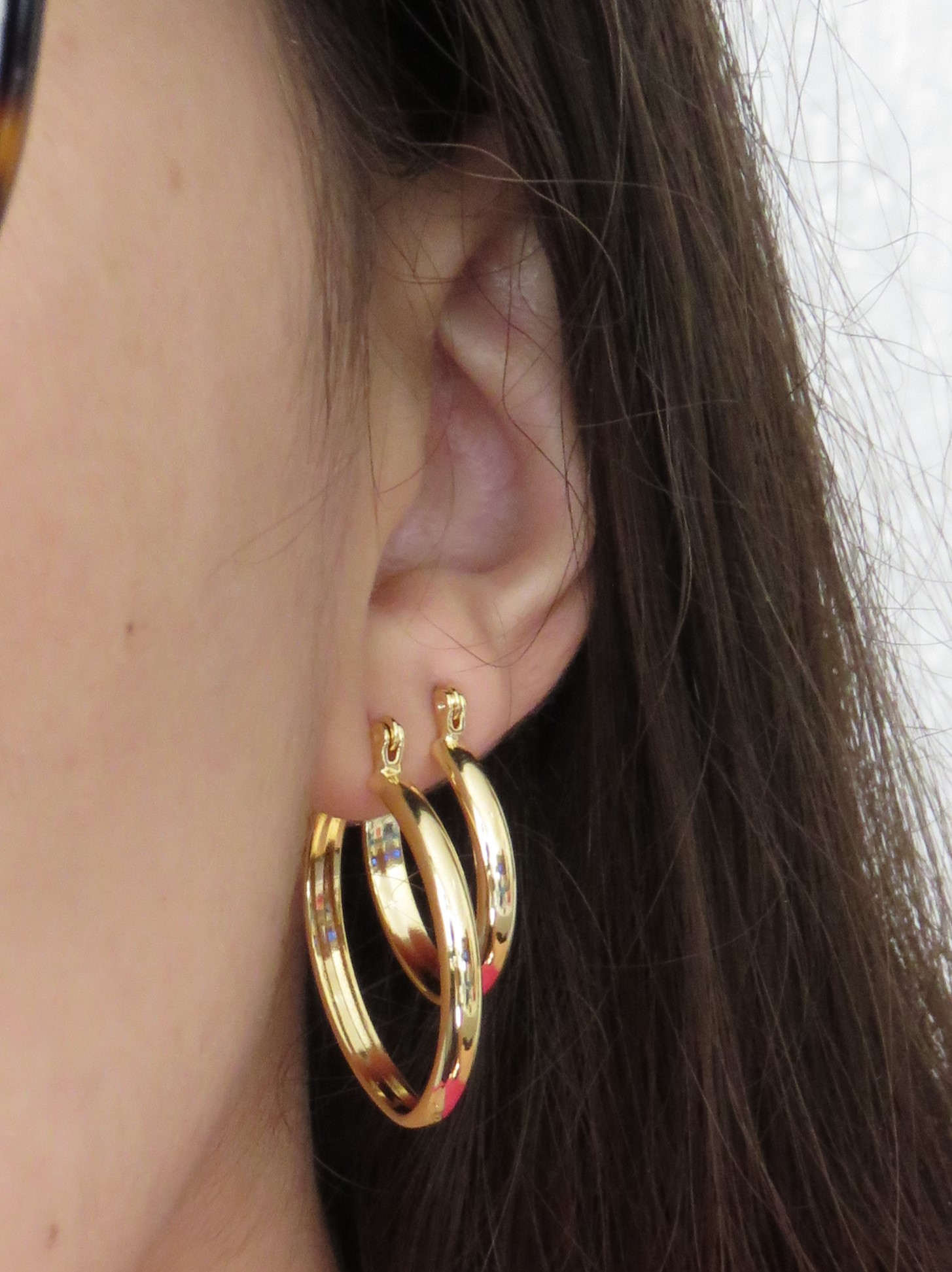Brinco de argola em formato de V. Disponível em dois tamanhos. Fechamento italiano. Banhado a ouro 18k.