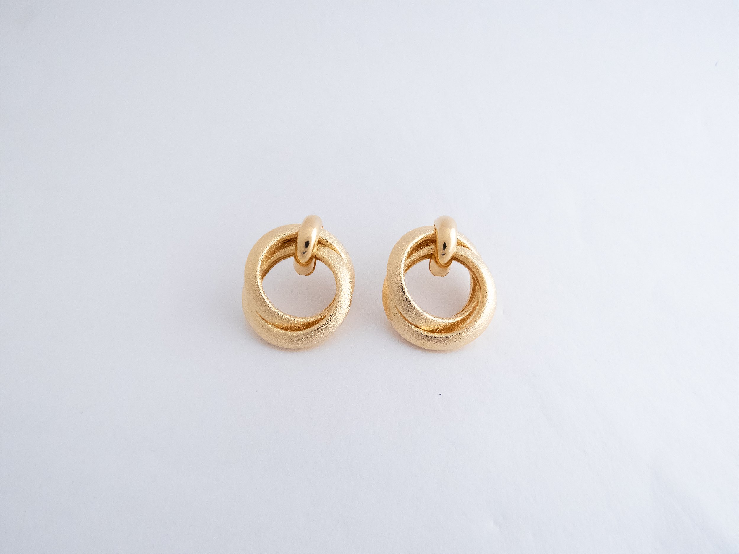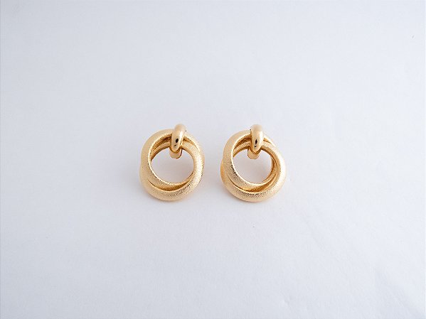 Brinco com 2 círculos entrelaçados com efeito craquelado. Fechamento em tarracha. Banhado a ouro 18k.