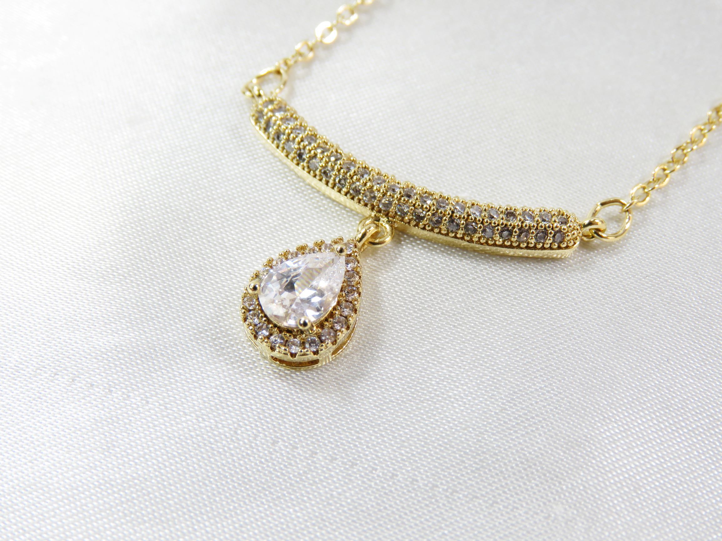 Colar base retangular toda cravejada na zircônia com pedra em formato de gota pendurada. Na corrente de elos. Banhado a ouro 18k.