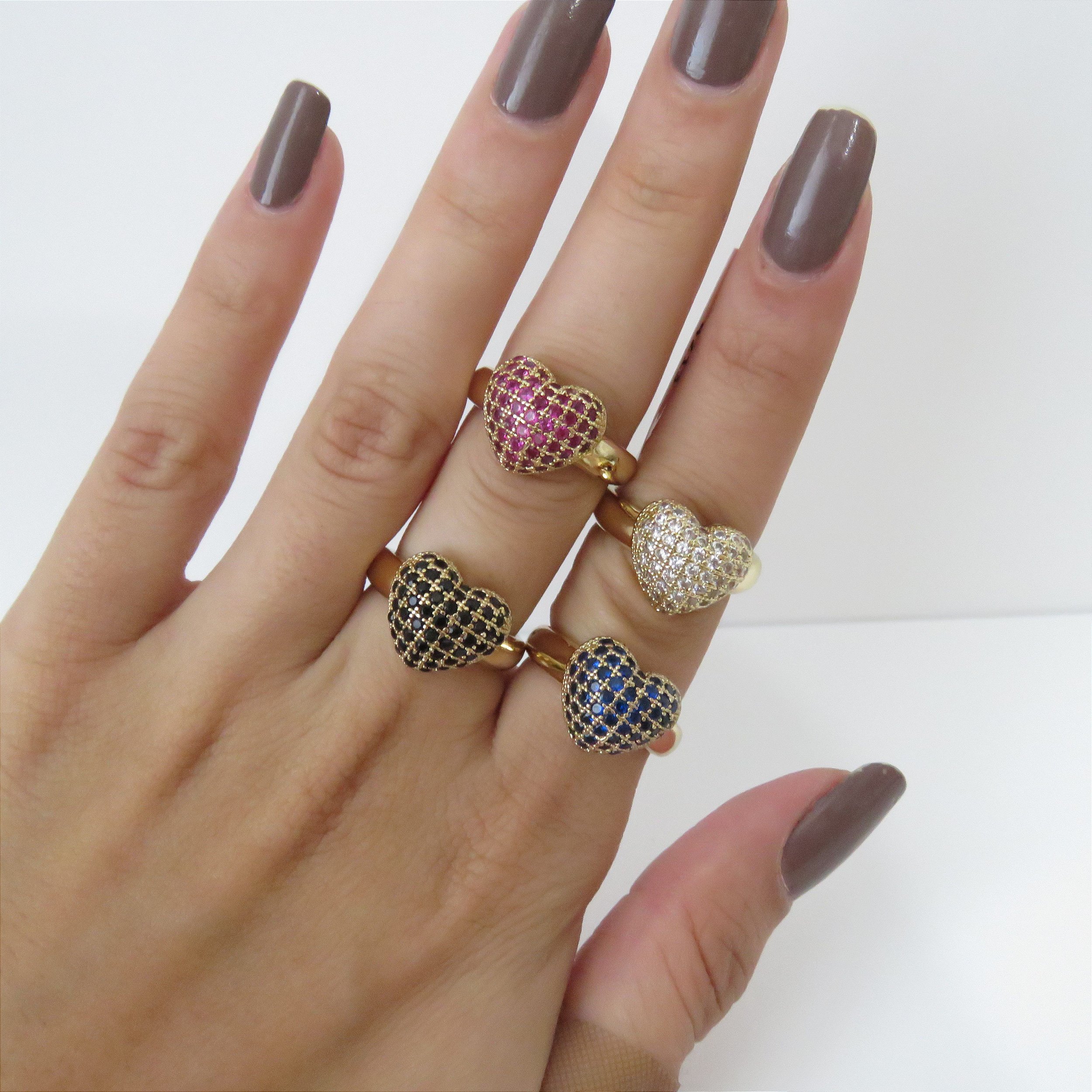 Anel estilo chuveiro, em formato de coração cravejado na zircônia e com detalhes no ródio. Banhado a ouro 18k.