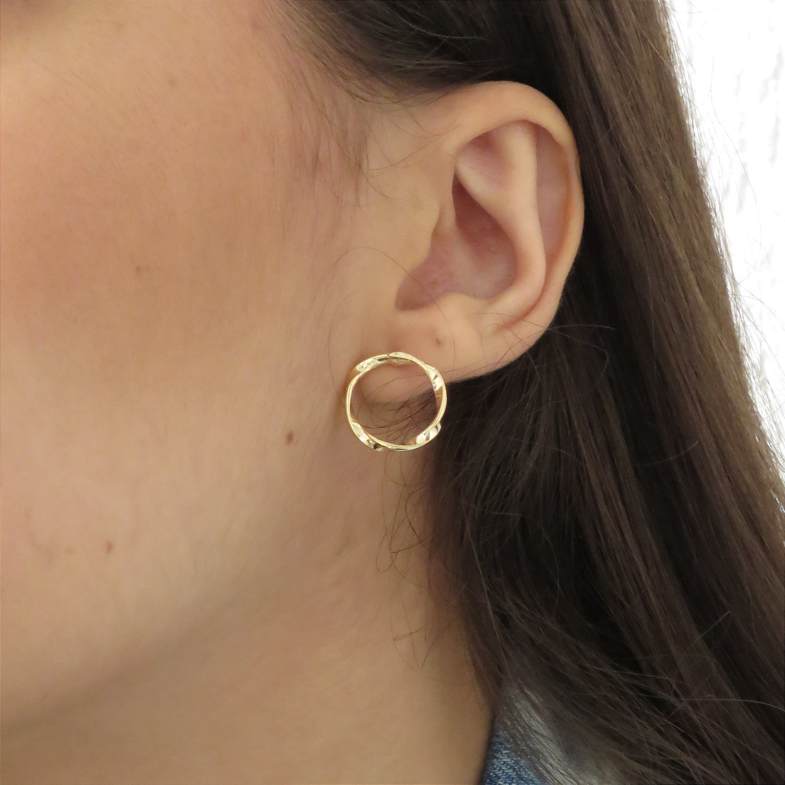 Brinco em formato de círculo levemente retorcido. Fechamento em tarracha. Banhado a ouro 18k.