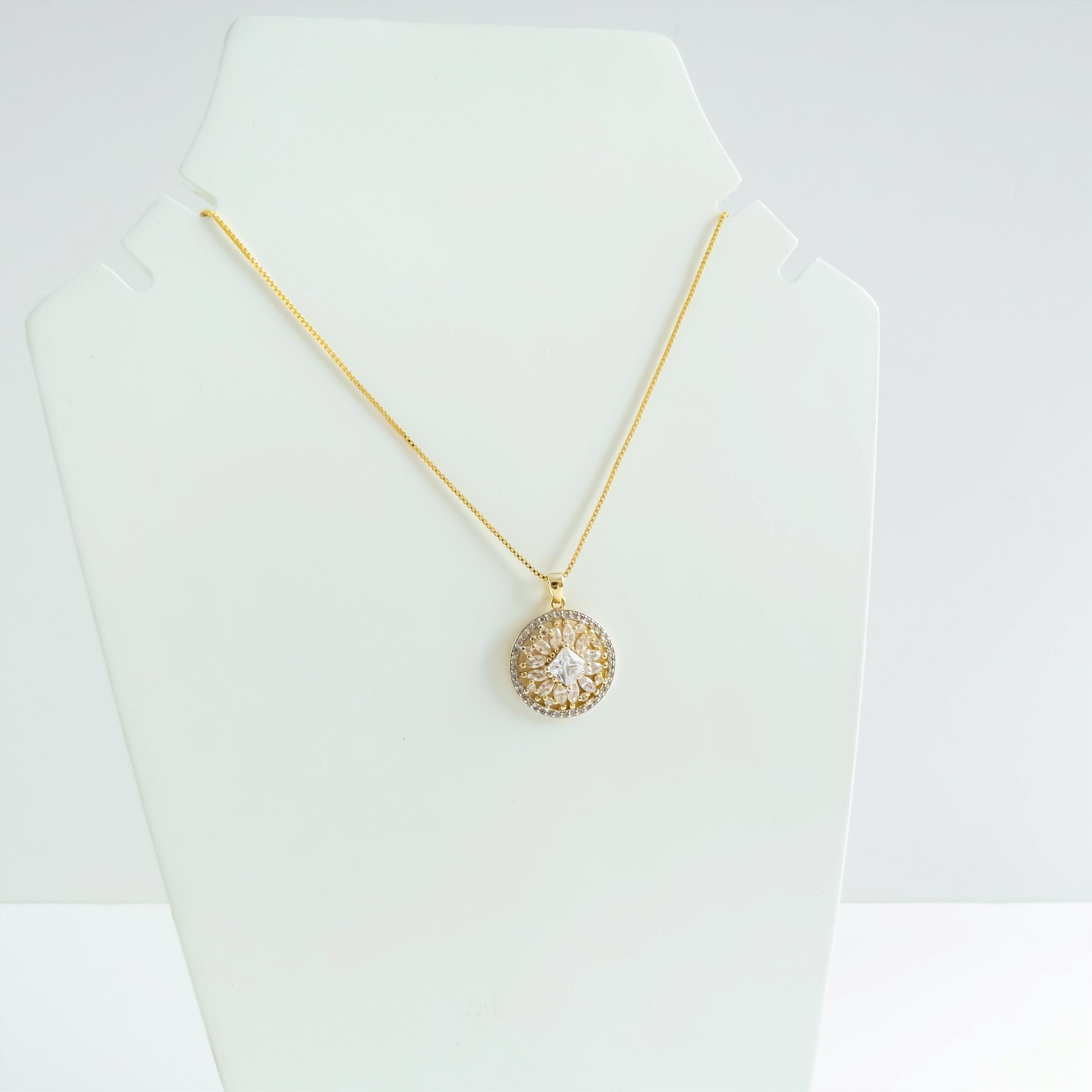 Colar com medalha cravejada nas zircônias, inclusive navete, com zircônia maior ao centro. Detalhes no ródio branco. Na corrente veneziana. Banhado a ouro 18k.