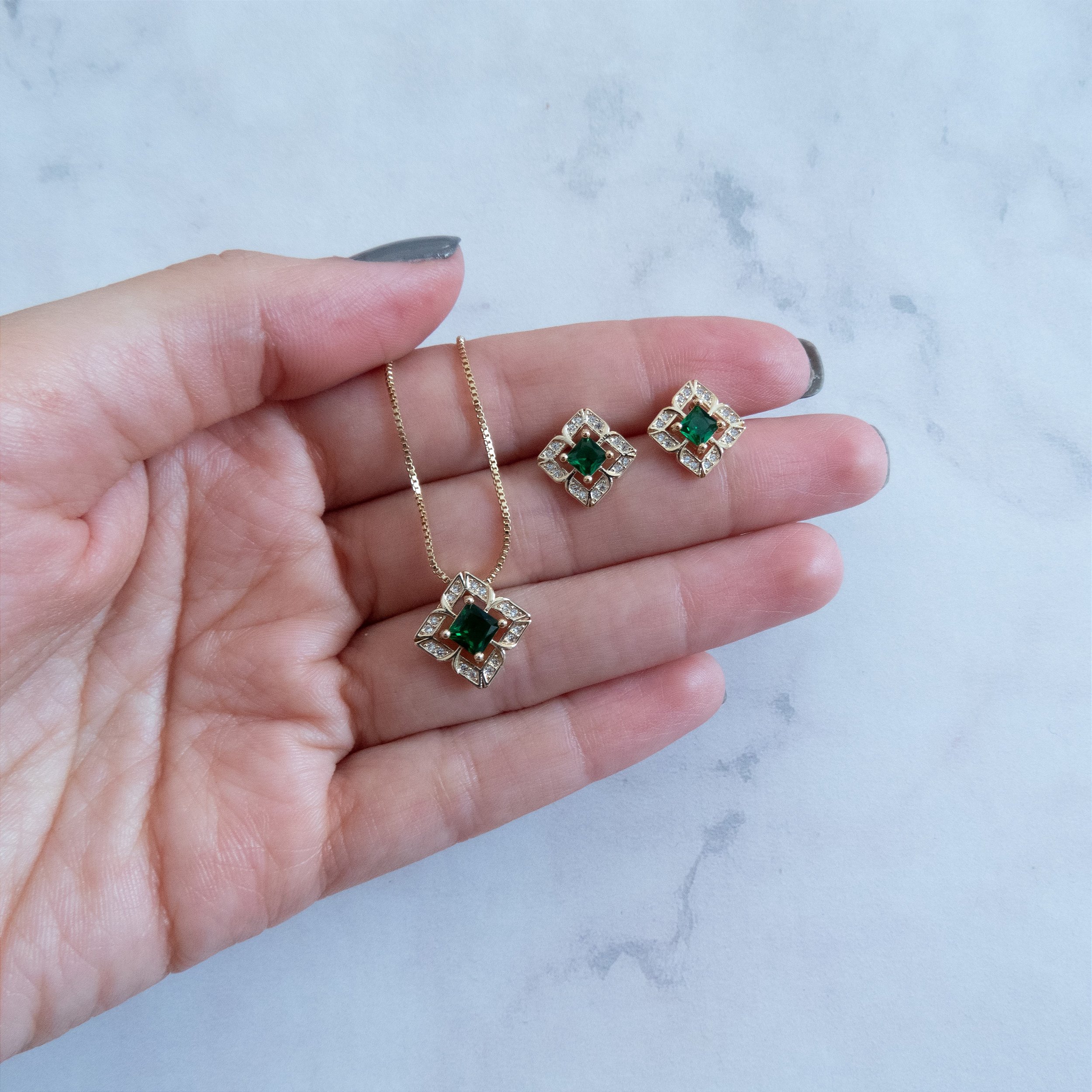 Conjunto em formato de losango com pedra verde no centro e cravejado na lateral. Banhado a ouro 18k.