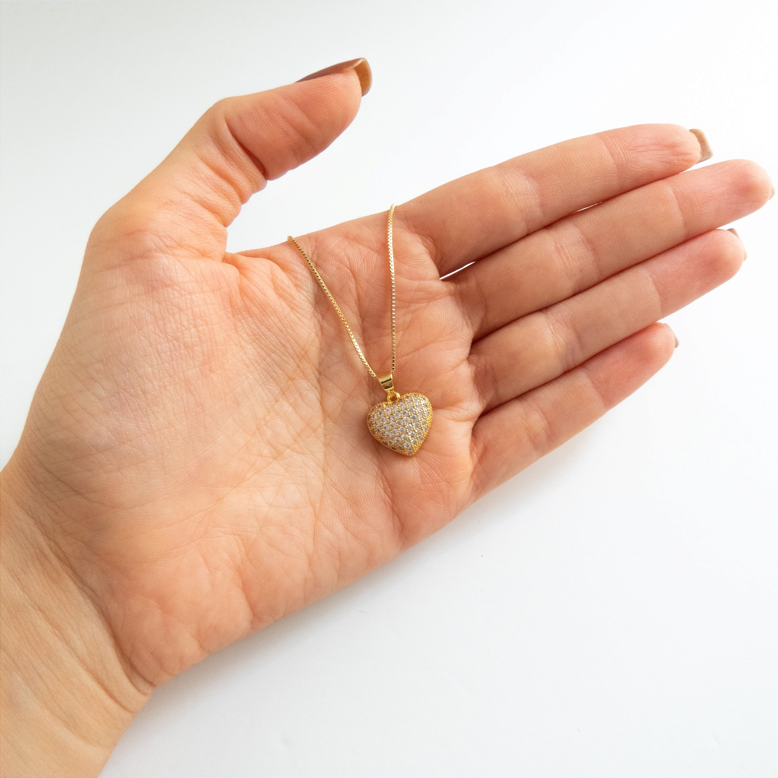 Colar com coração pendurado cravejado na zircônia. Na corrente veneziana. Banhado a ouro 18k.