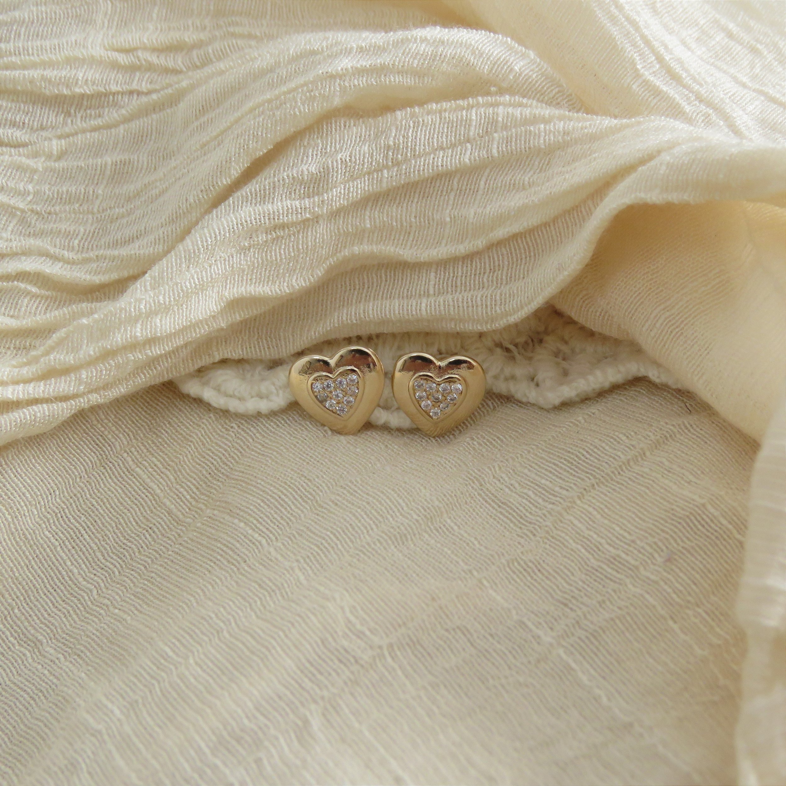 Brinco em formato de coração com zircônias cravejadas ao centro. Fechamento em tarracha. Banhado a ouro 18k.