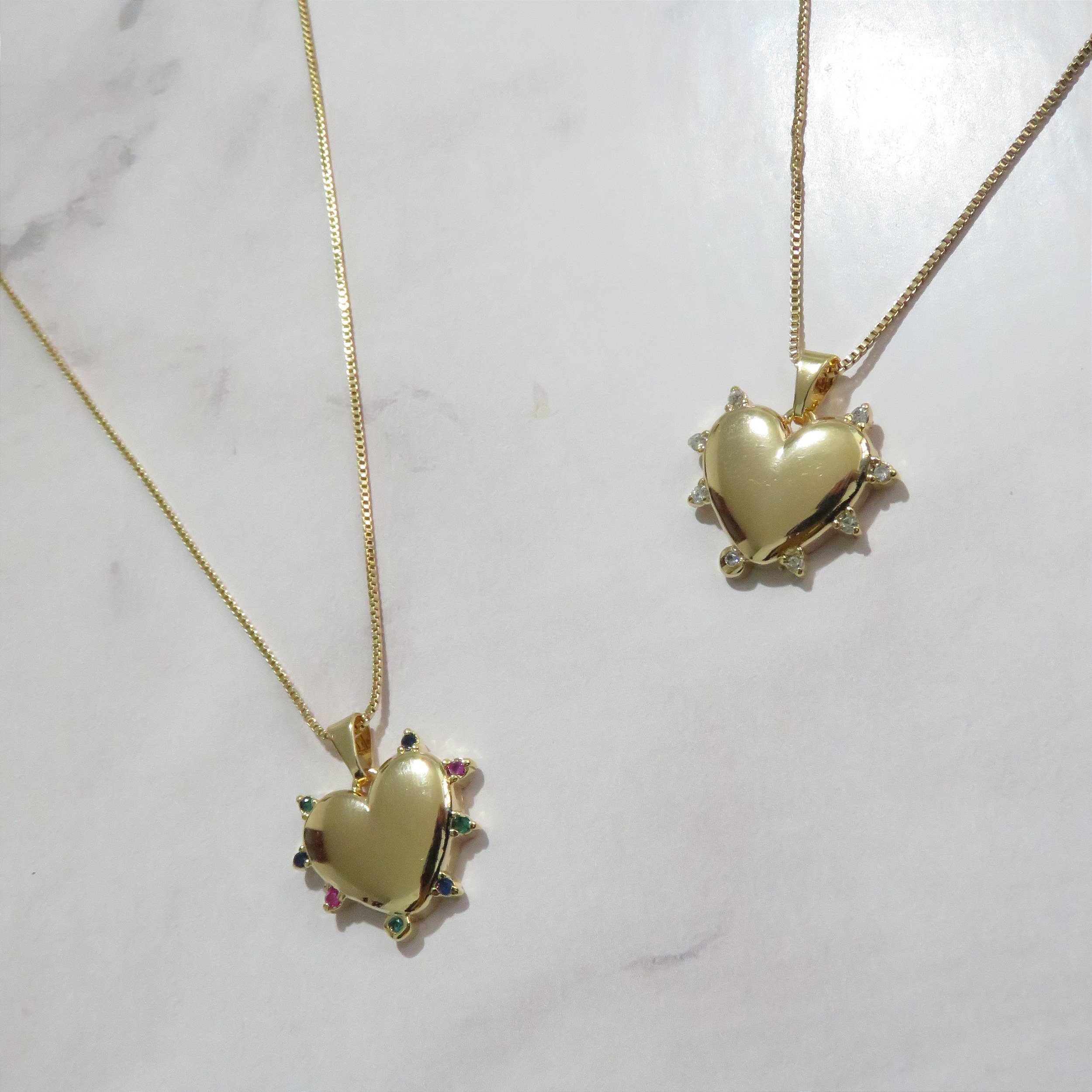 Cordão com pingente de coração e zircônias cravadas em volta. Na corrente veneziana. Banhado a ouro 18k.