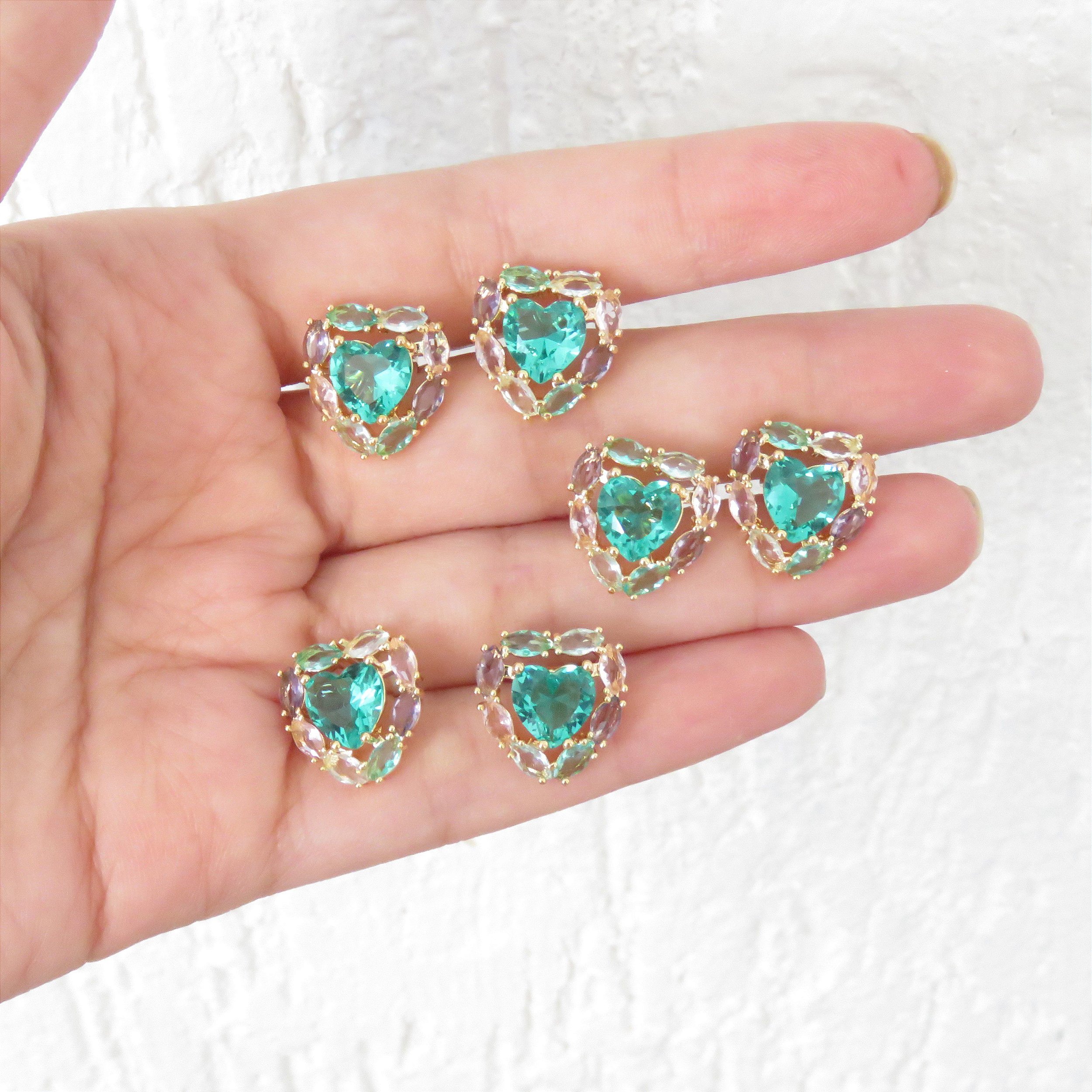 Brinco coração pedra verde turmalina ao centro com pedras em volta. Fechamento pino e tarracha. Banhado a ouro 18k.