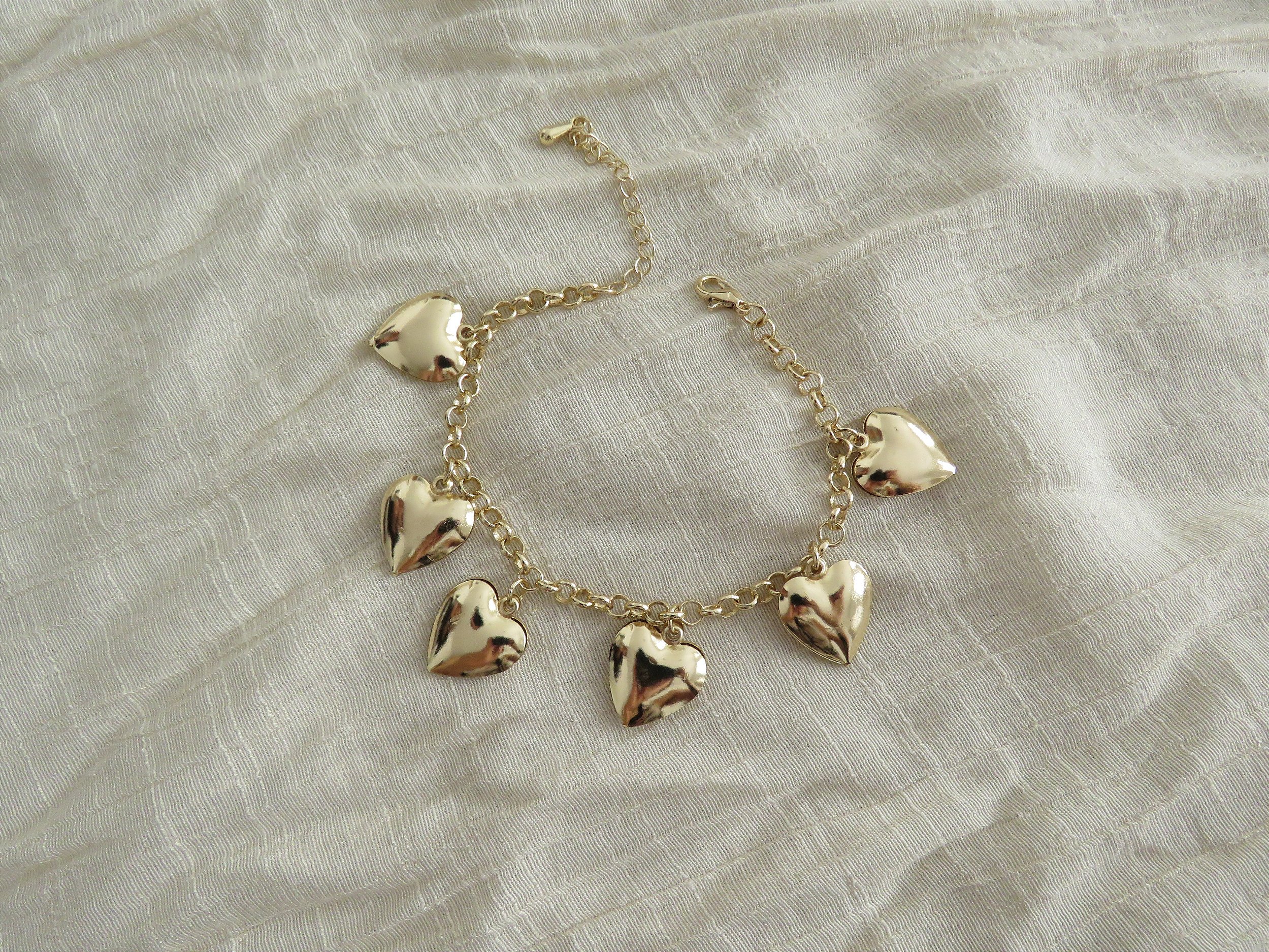 Pulseira corações abaulados pendurados. Banhado a ouro 18k.