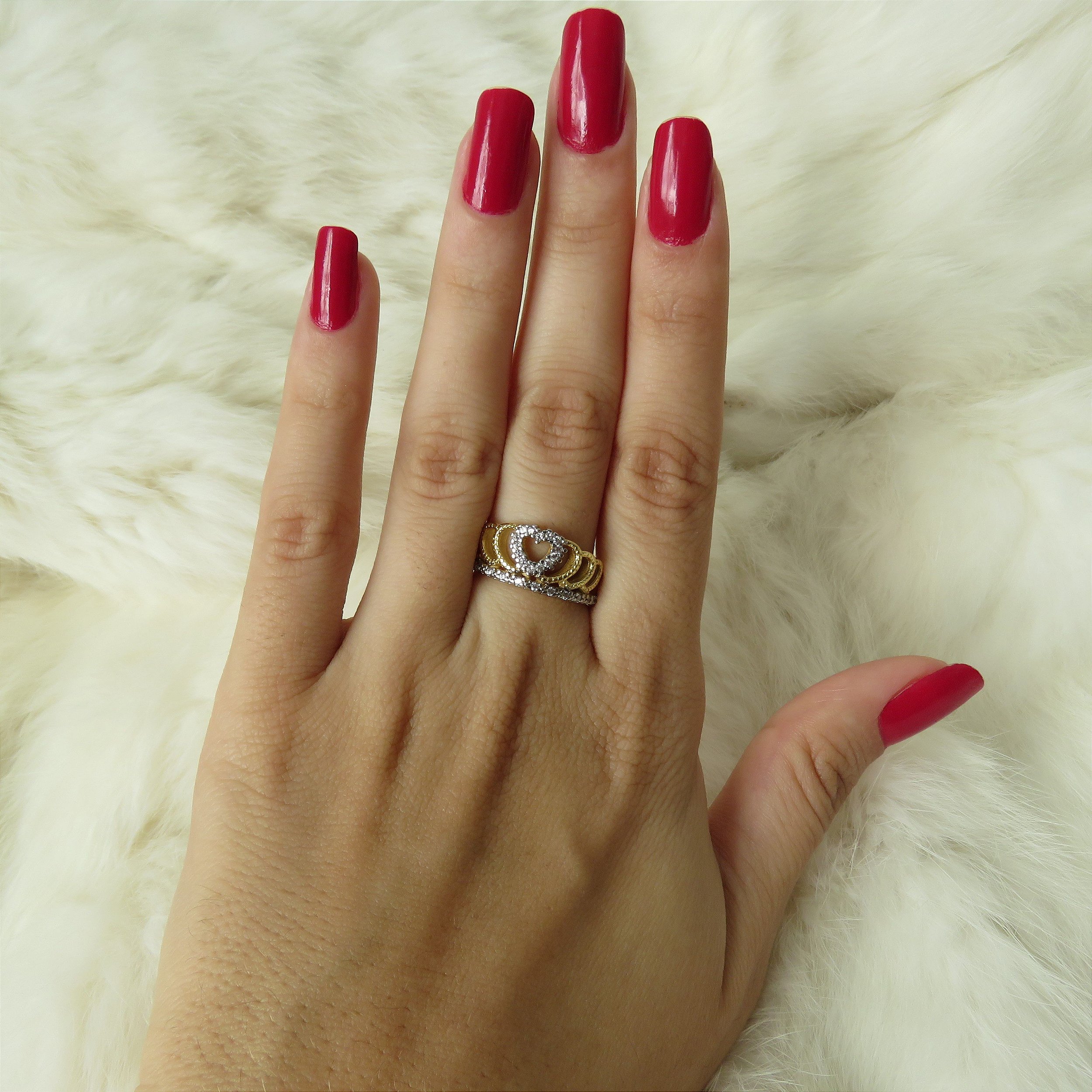 Anel coroa com coração ao centro com detalhes na zircônia e ródio, banhado a ouro 18k.