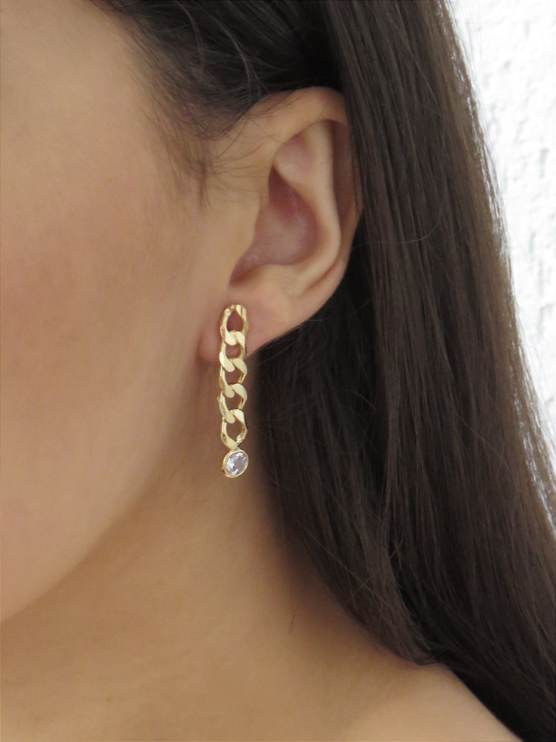 Brinco de corrente com ponto de luz zircônia na ponta. Fechamento em tarracha. Banhado a ouro 18k.