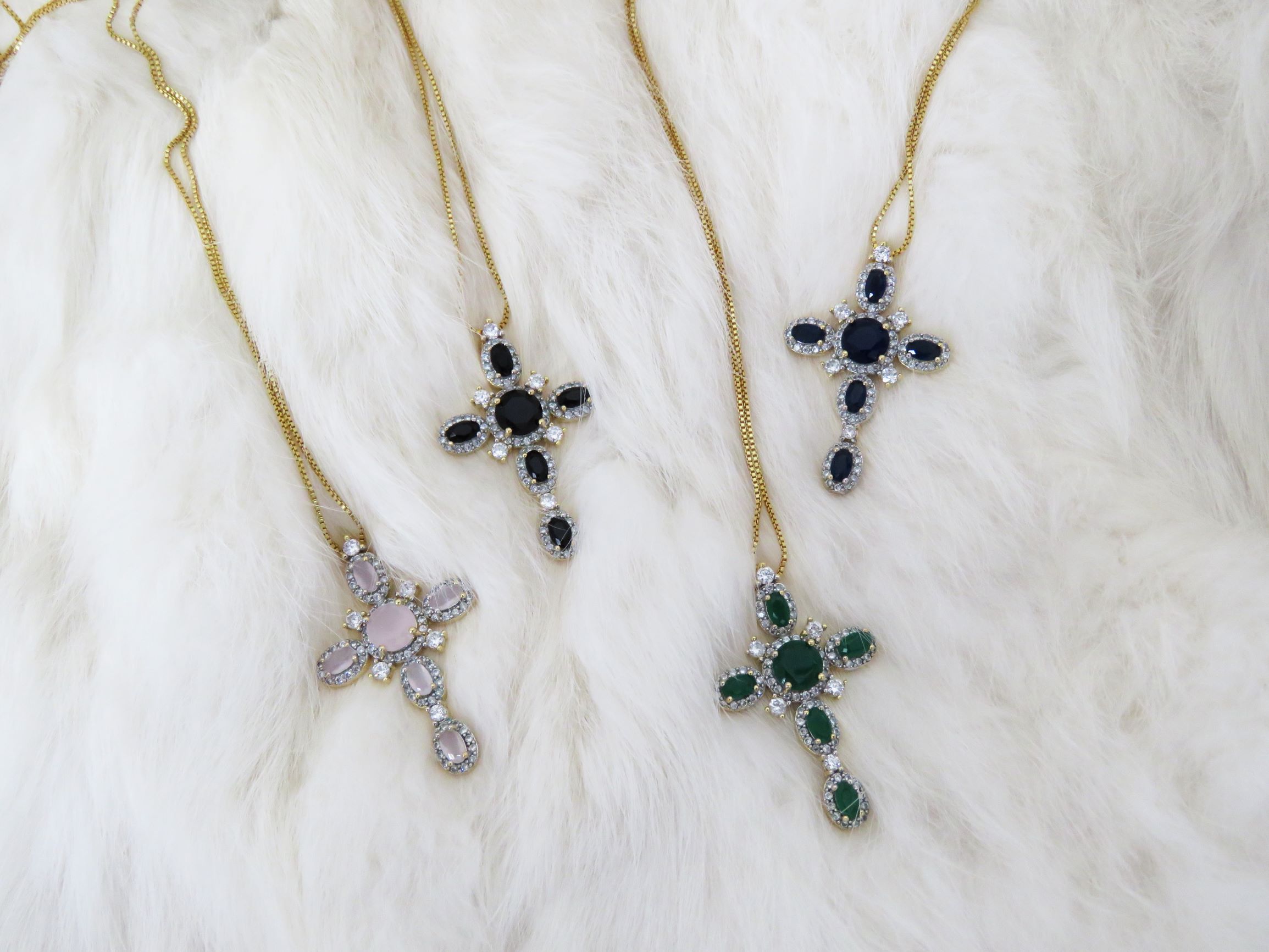 Colar com pingente de cruz pedra com detalhes em microzircônia cravejada e ródio branco. Na corrente veneziana. Banhado a ouro 18k.