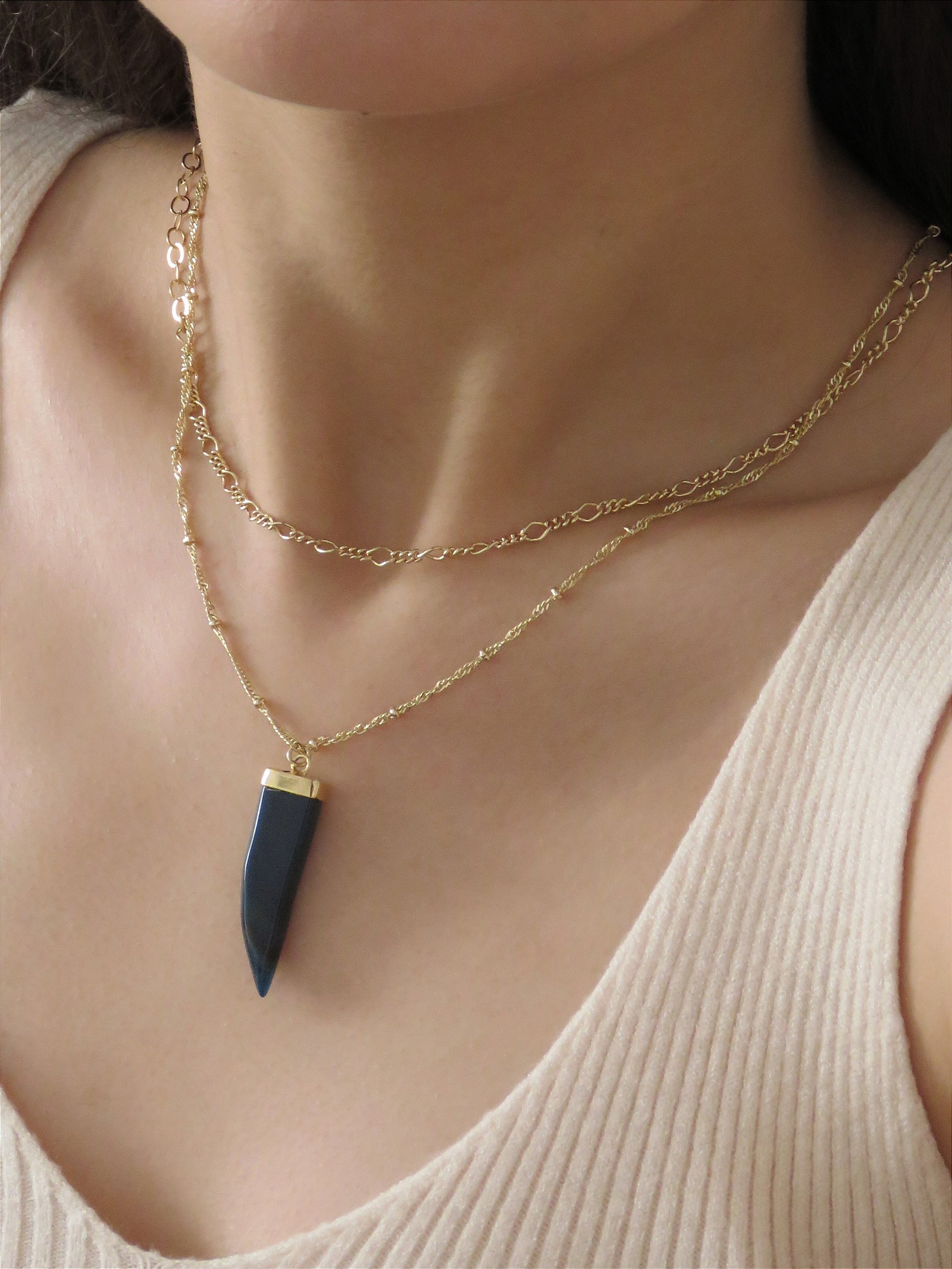 Cordão com pingente na pedra azul em formato de dente. Na corrente de bolinha. Banhada a ouro 18k.