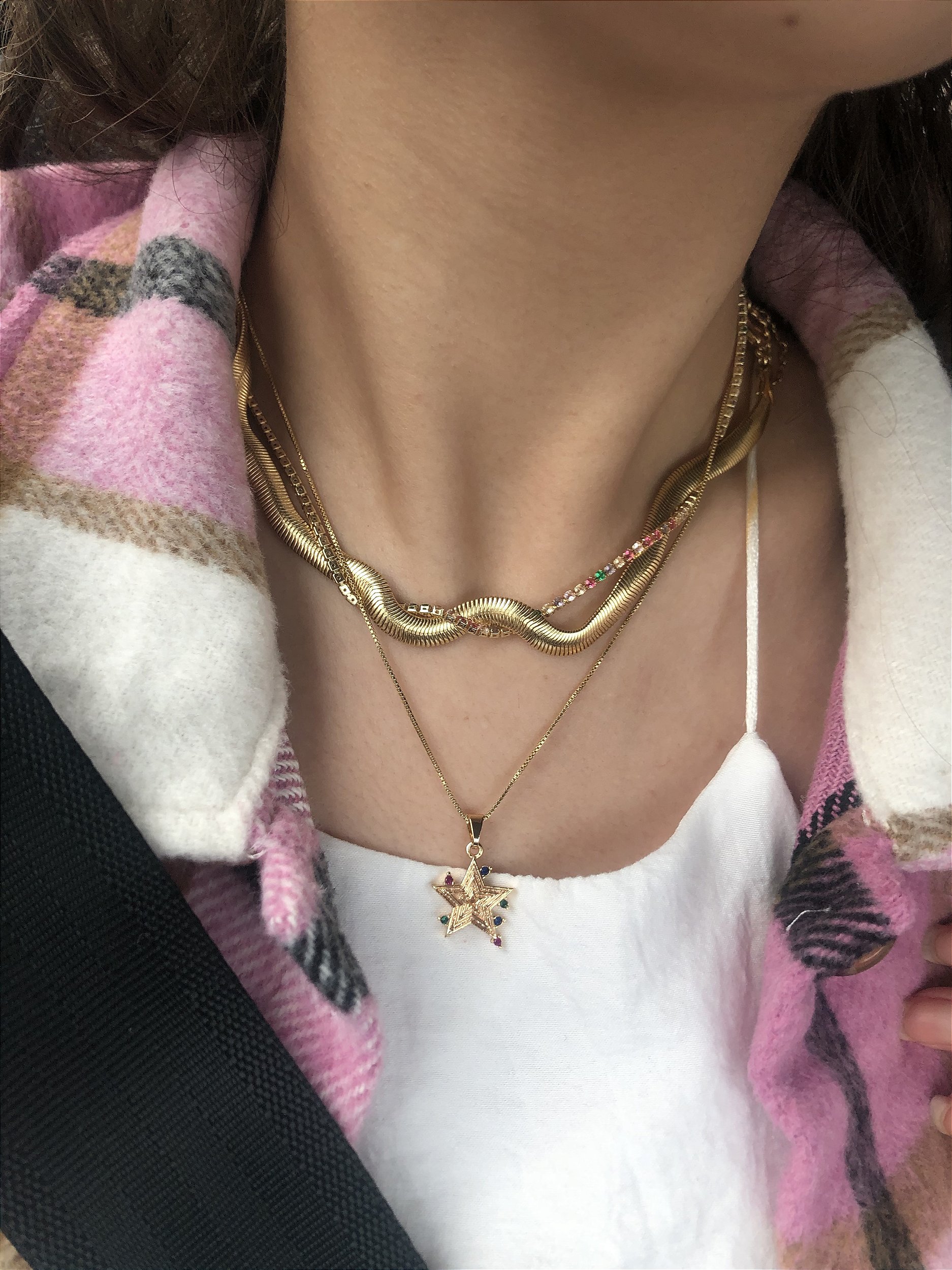 Cordão com pingente de estrela e zircônias coloridas em volta. Banhado a ouro 18k.