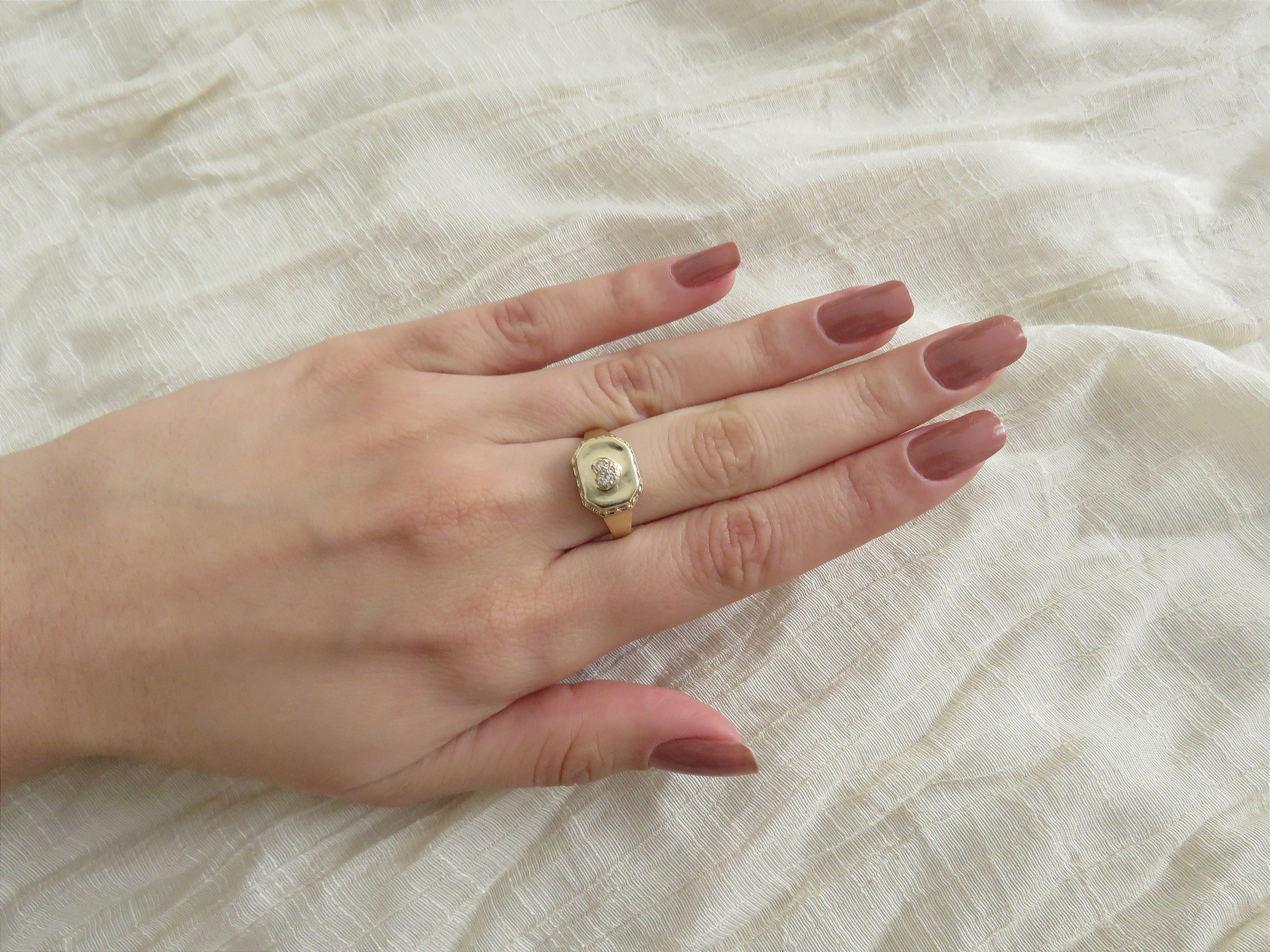 Anel quadrado com coração cravejado no meio, disponível em várias numerações. Banhado a ouro 18k.