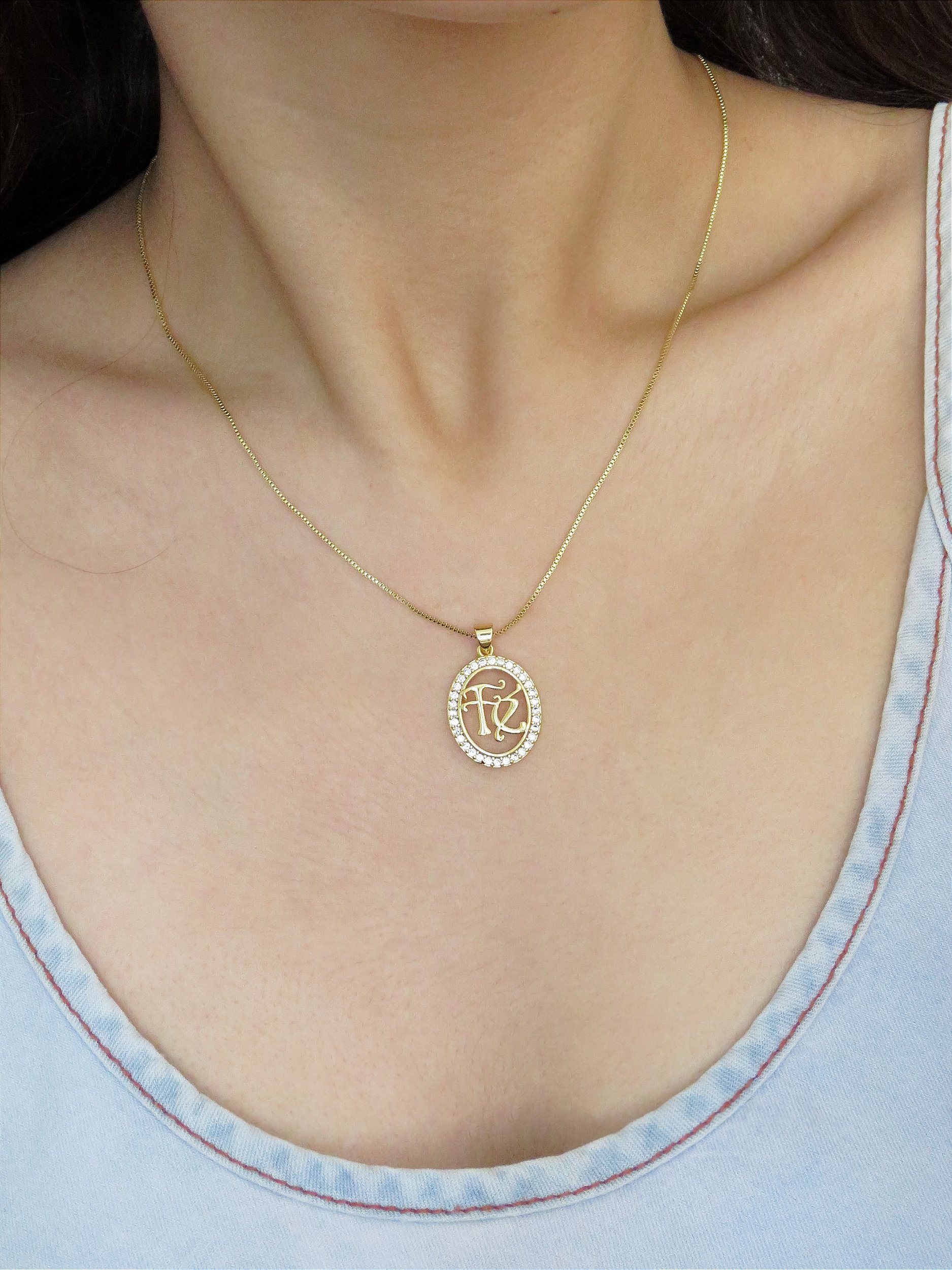 Cordão com pingente de medalha cravejada em volta, escrito FÉ. Na corrente veneziana. Banhado a ouro 18k.