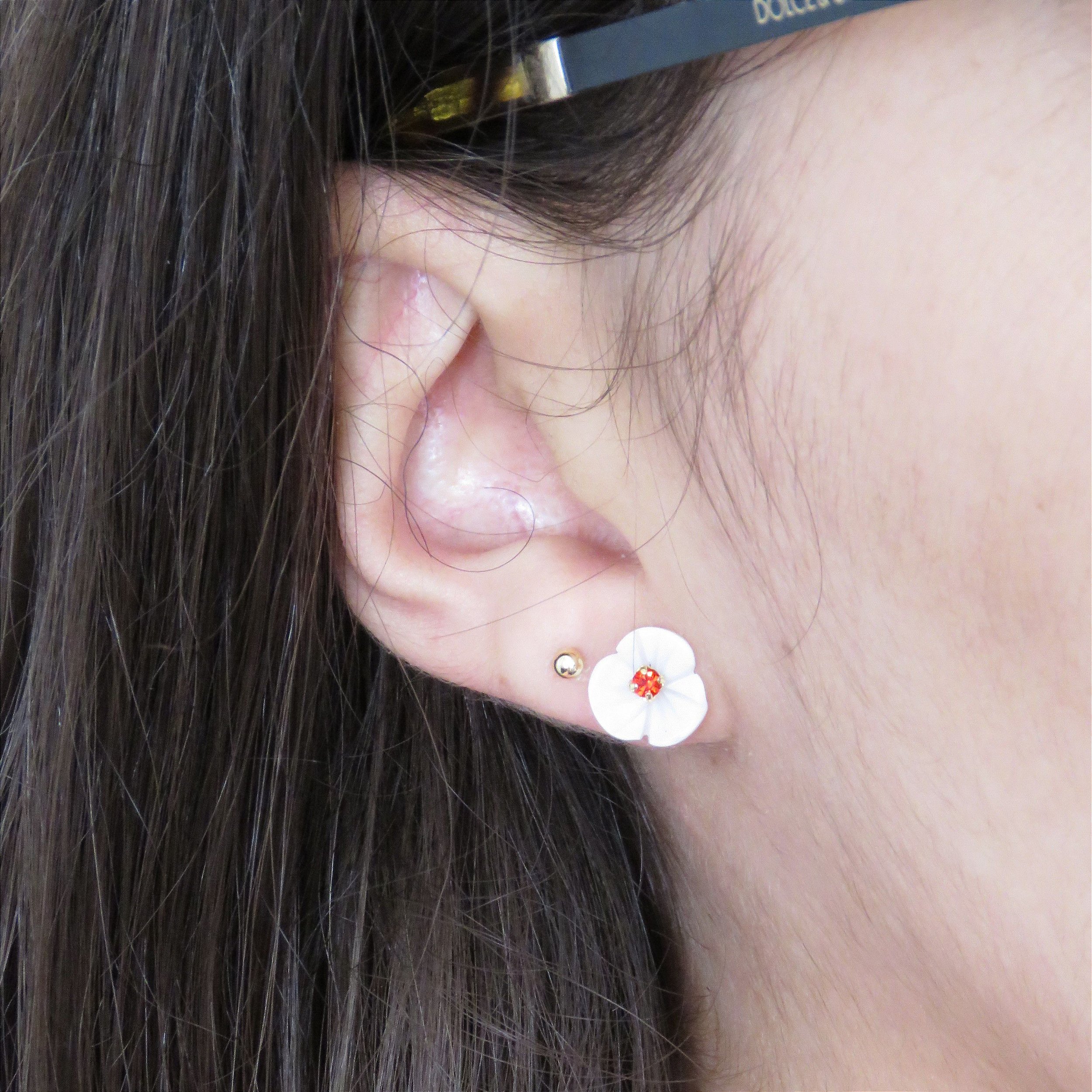 Brinco flor madrepérola com ponto de luz na zircônia como miolo. Miolo removível, pode usar separadamente. Fechamento pino e tarracha. Banhado a ouro 18k.