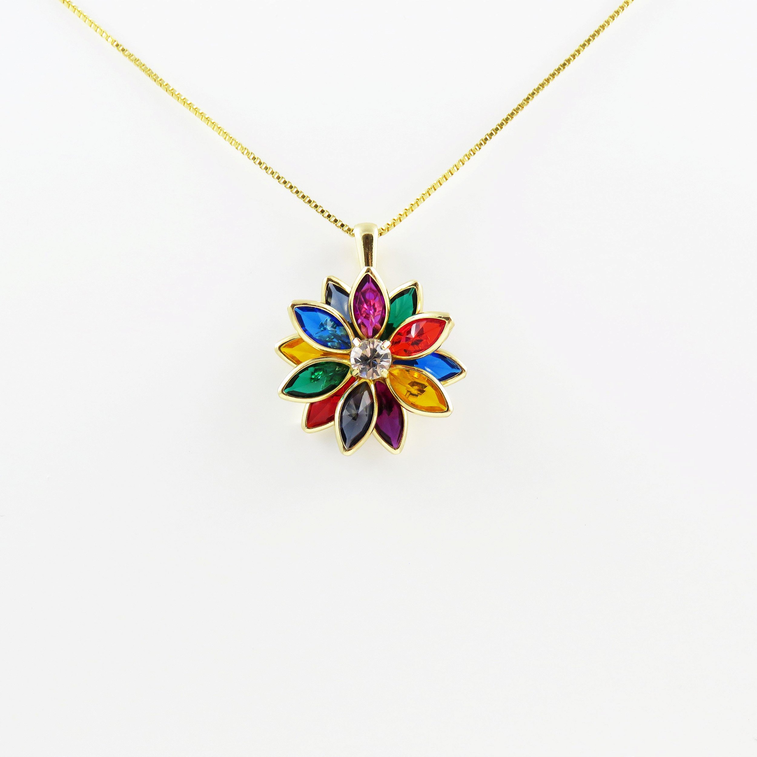 Colar com pingente de flor pétalas sintética. Na corrente veneziana. Banhado a ouro 18k.