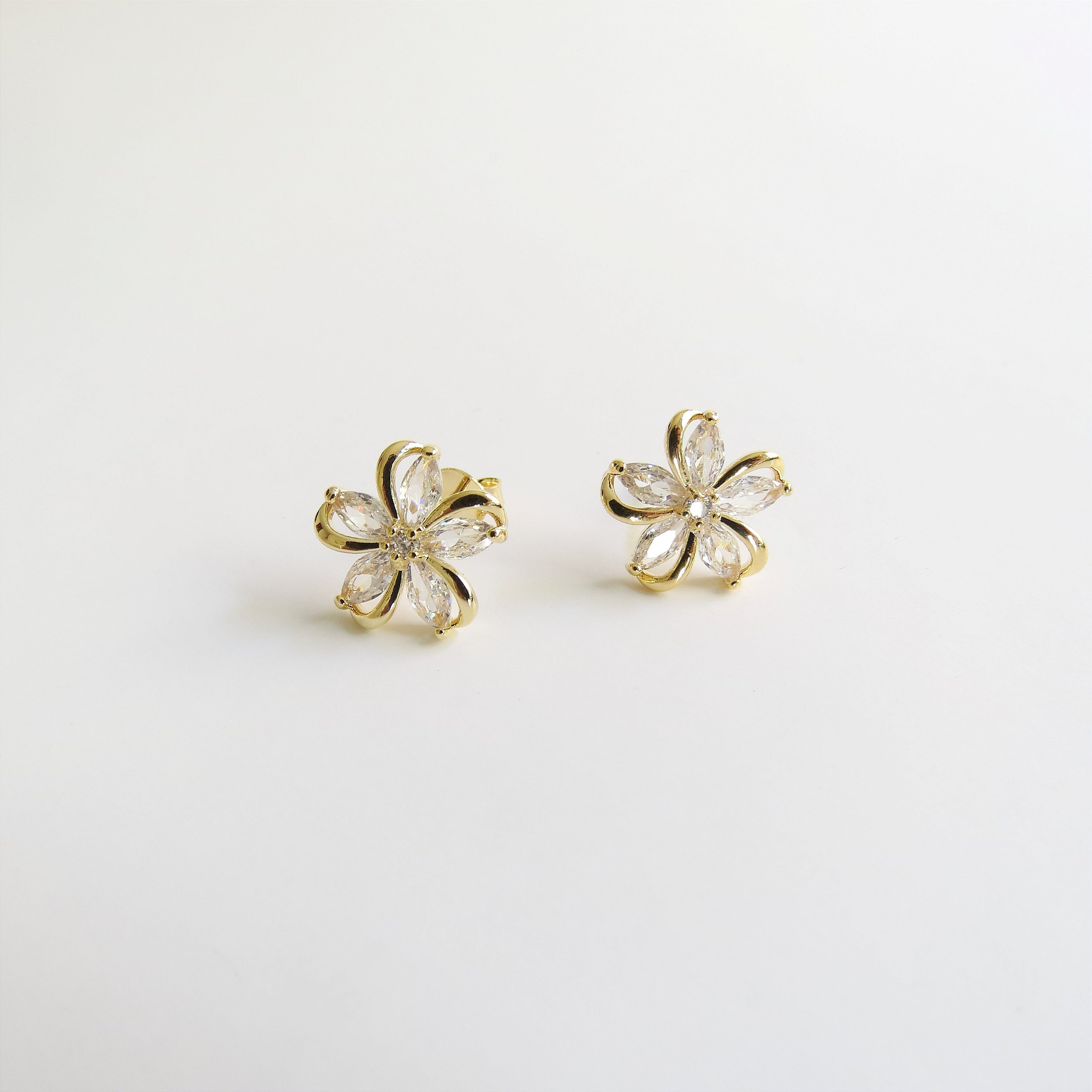 Brinco em formato de flor com pétalas na zircônia. Banhado a ouro 18k.