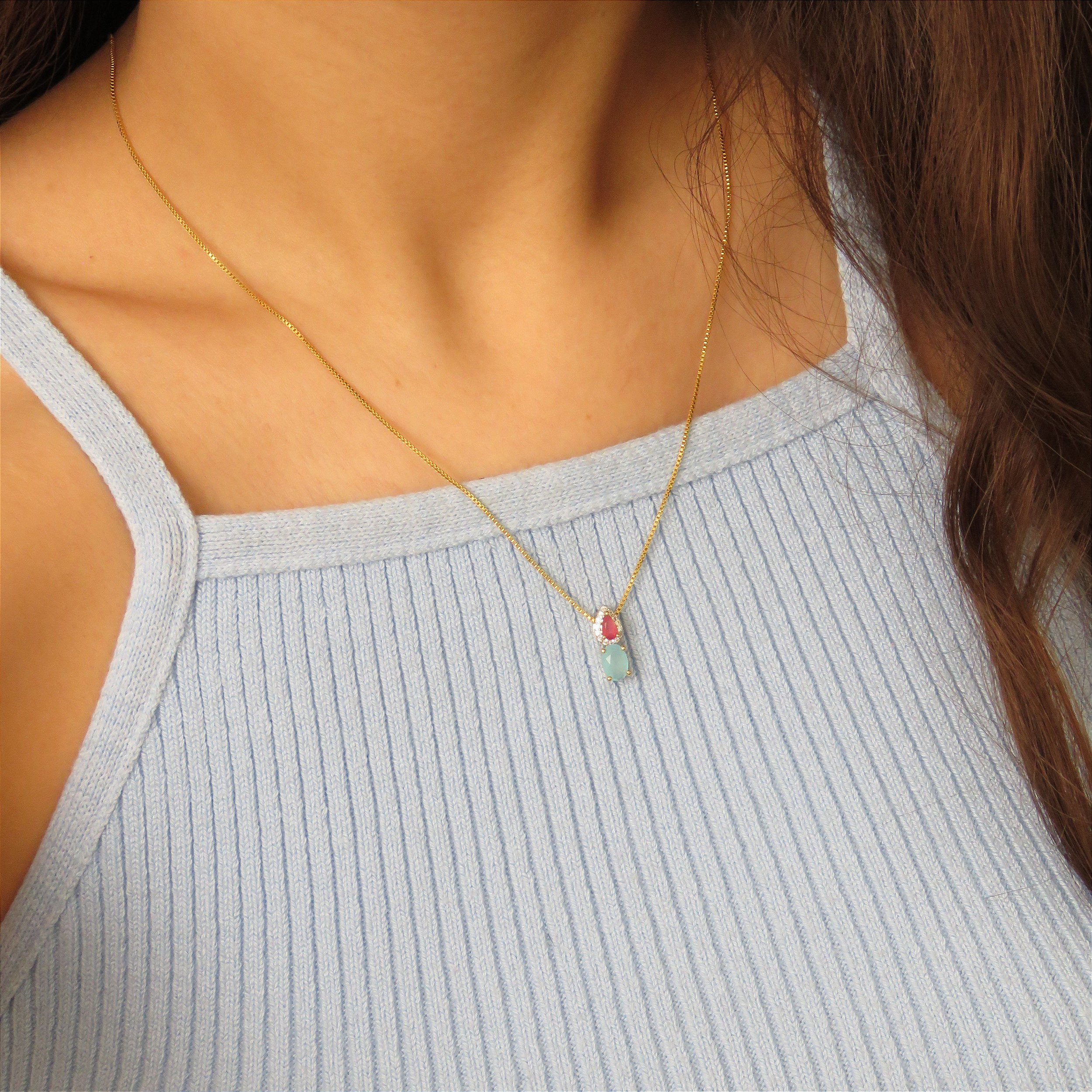 Colar pedra cor com detalhes em microzircônia e ródio branco. Na corrente veneziana. Banhado a ouro 18k.