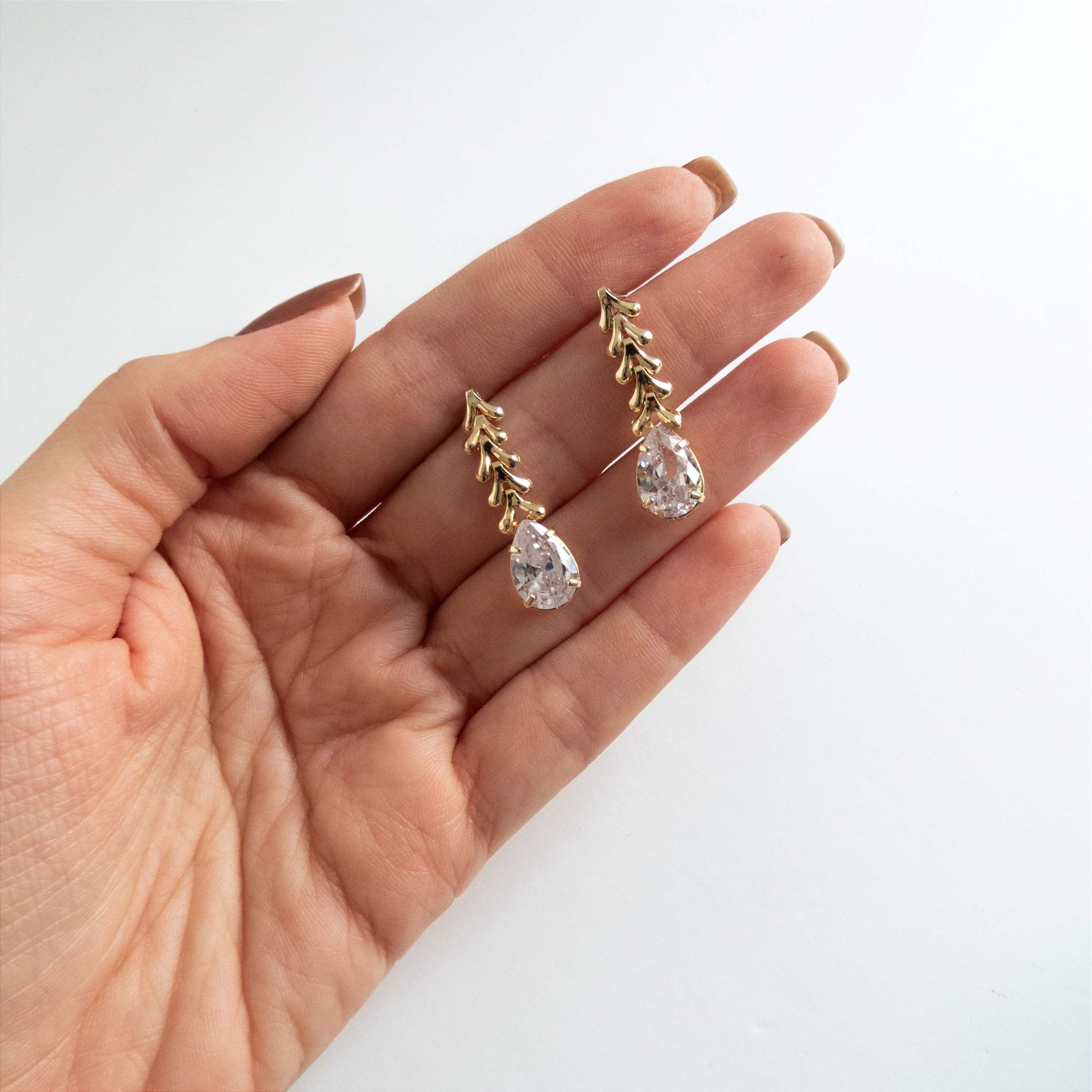 Brinco com zircônia em formato de gota pendurada. Fechamento em tarracha. Banhado a ouro 18k.