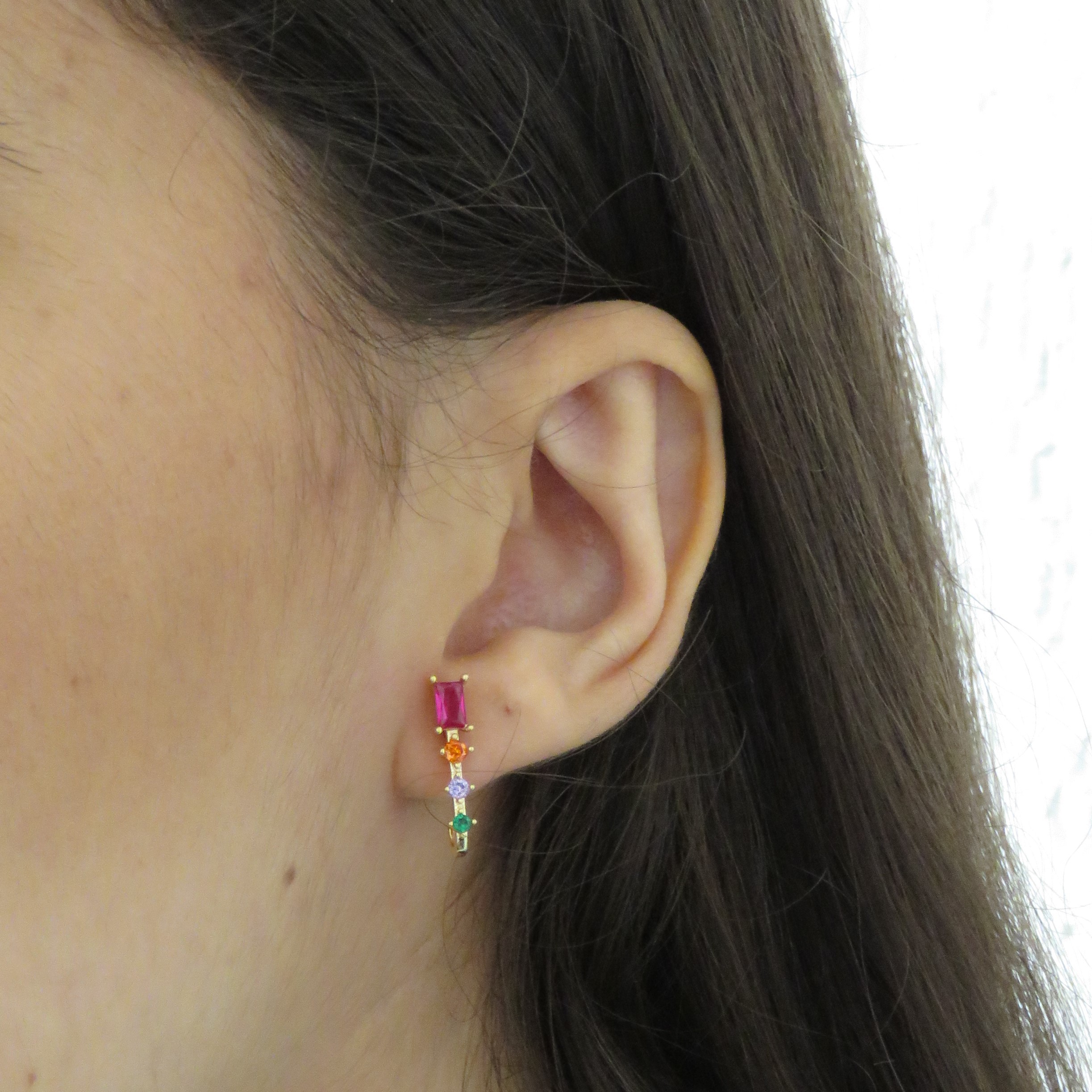 Brinco formato J com pedras coloridas. Fechamento em tarracha. Banhado a ouro 18k.