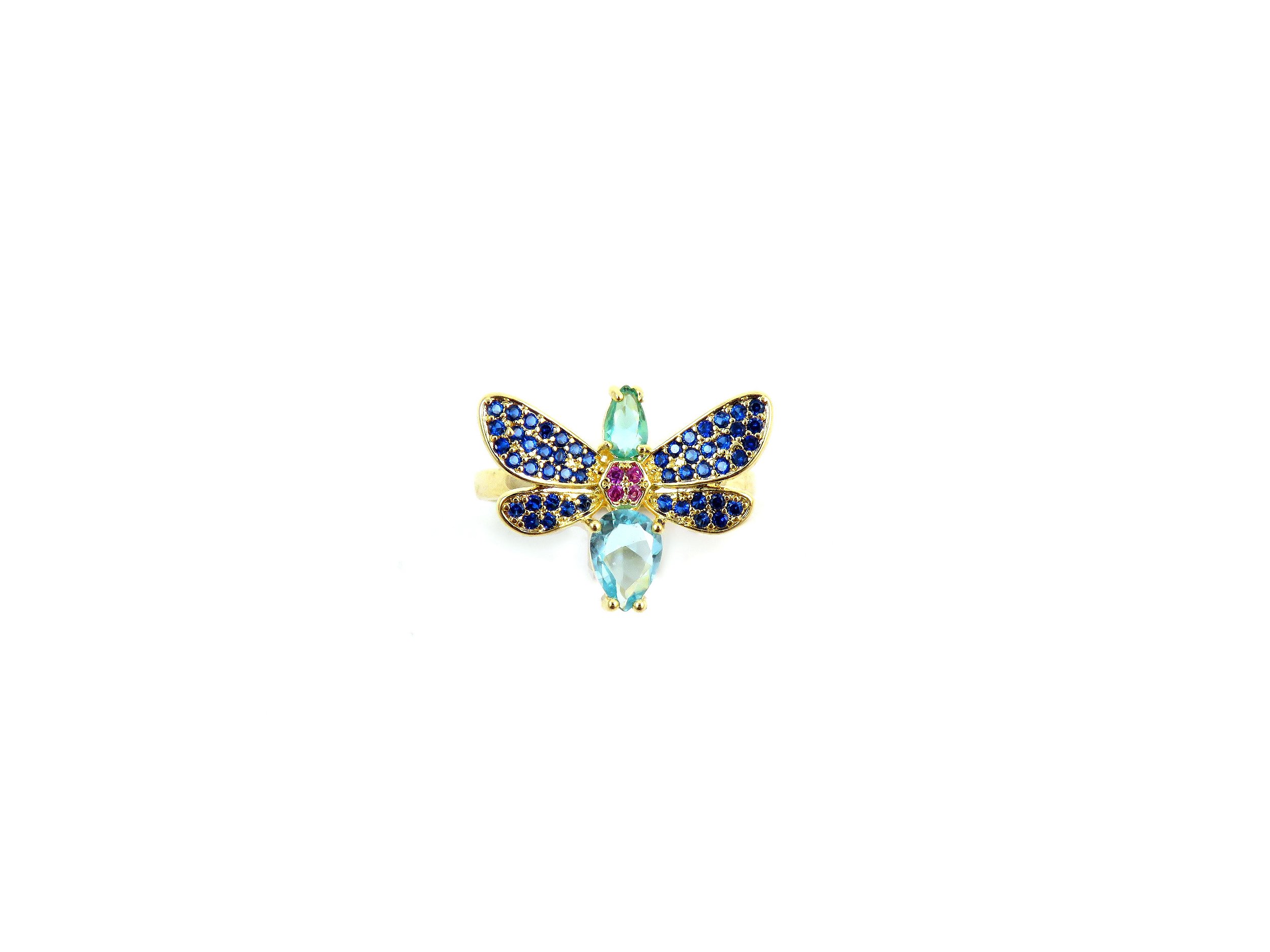 Anel em formato de libélula com pedra e cravejado na zircônia, banhado a ouro 18k.