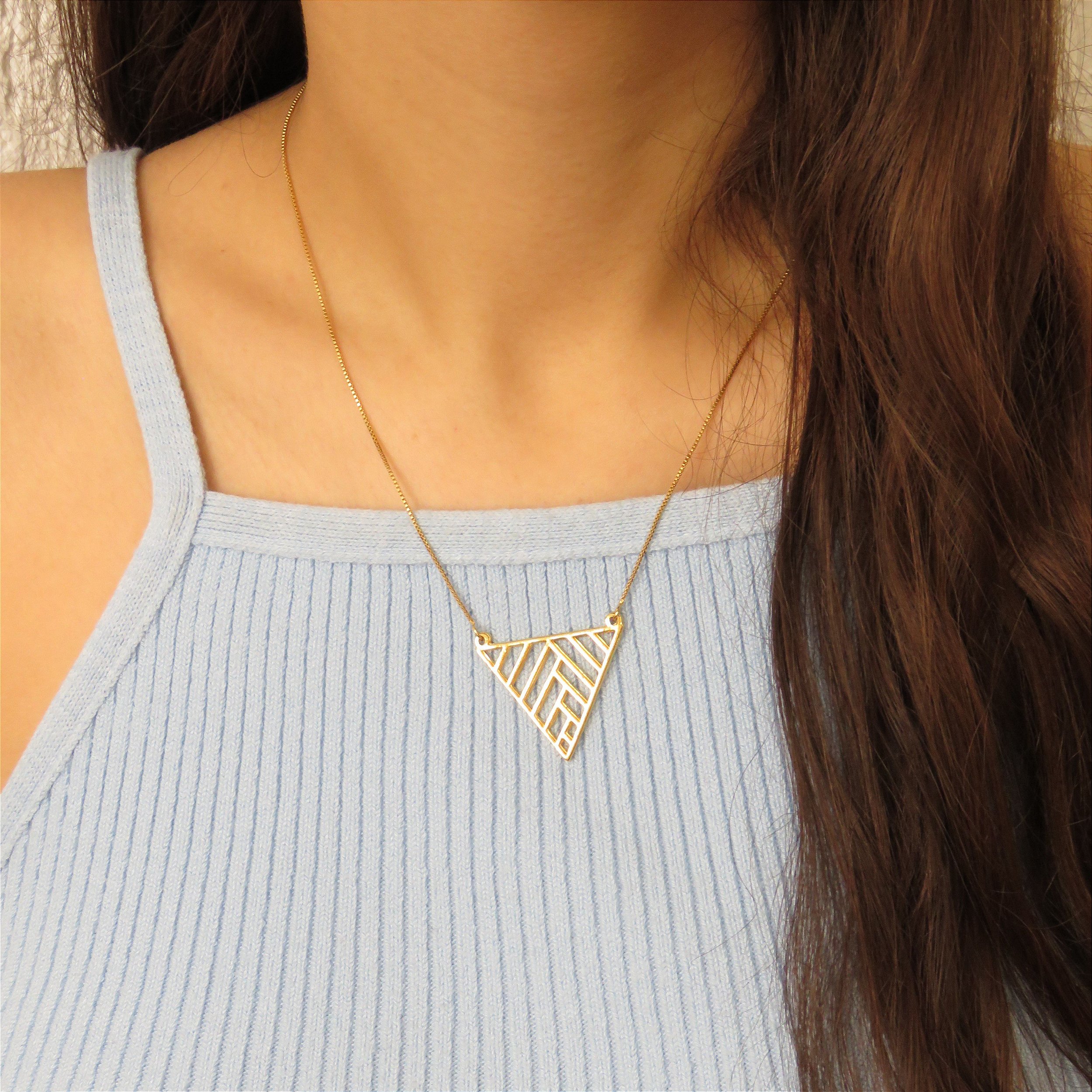 Colar triângulo trabalhado e detalhado. Na corrente veneziana. Banhado a ouro 18k.
