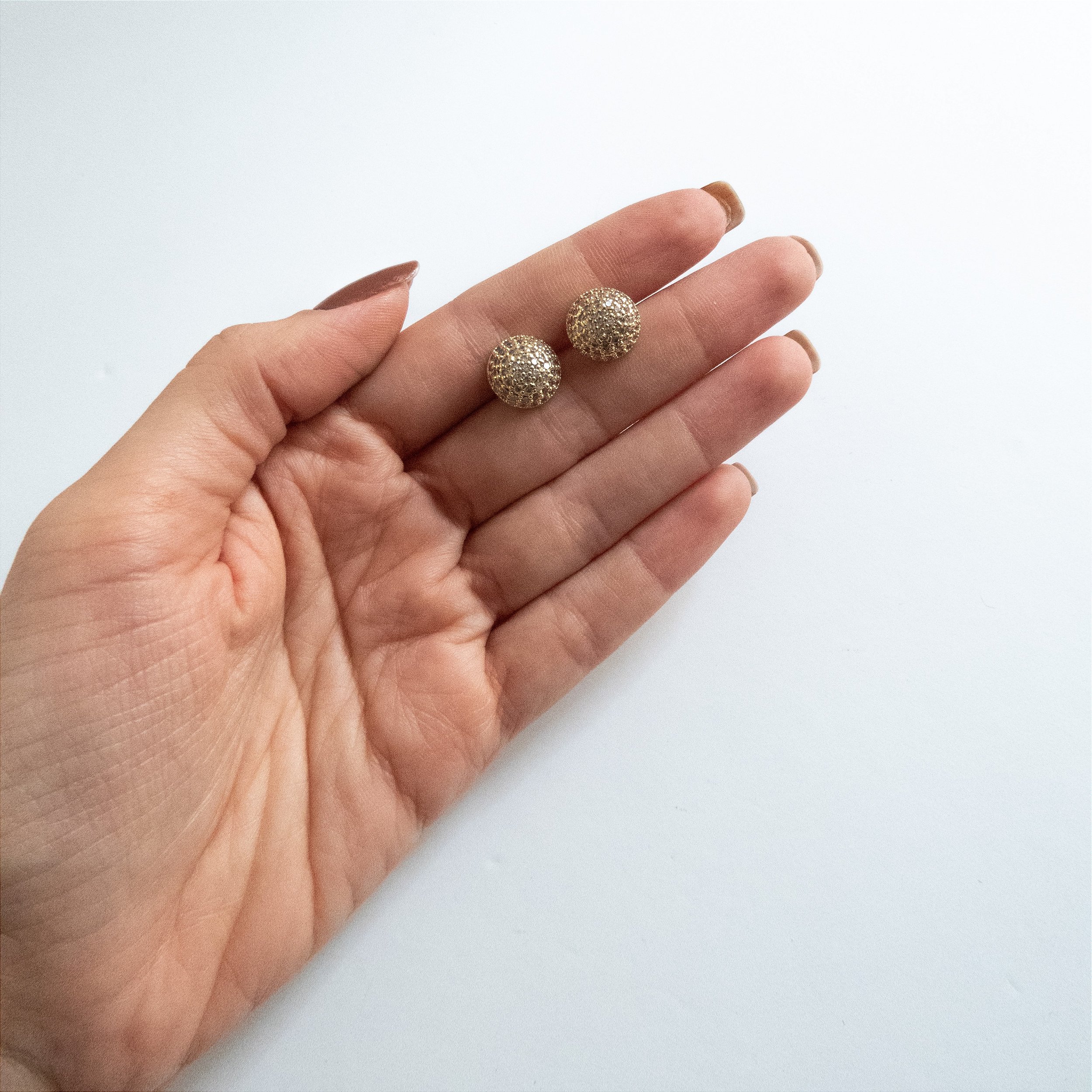 Brinco meia bola toda cravejada na zircônia. Fechamento de pino e tarracha. Banhado a ouro 18k.