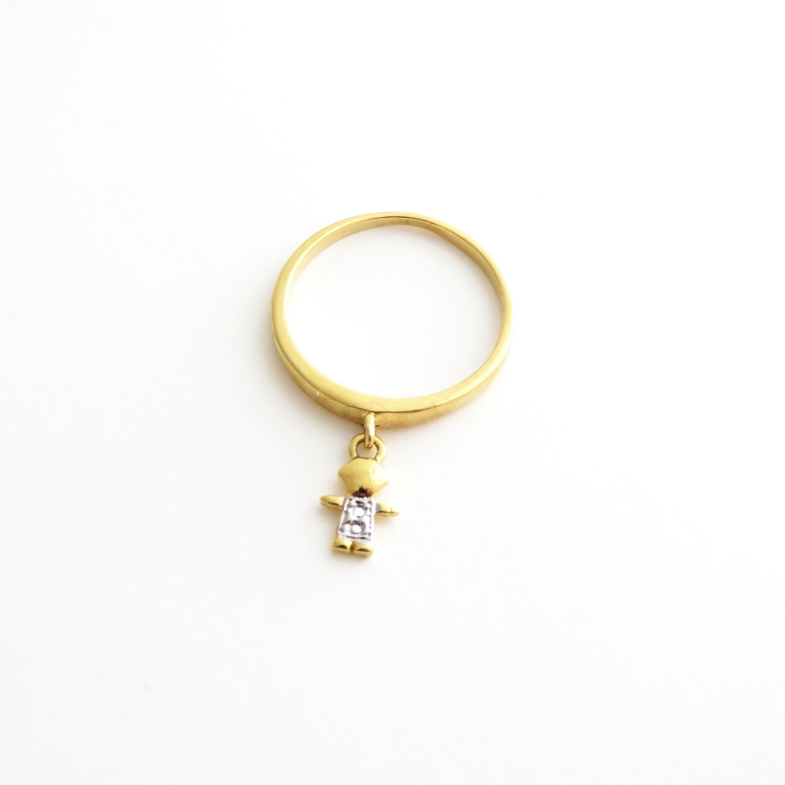 Anel metal com pingente de menino pendurado e com detalhes no ródio branco, banhado a ouro 18k.