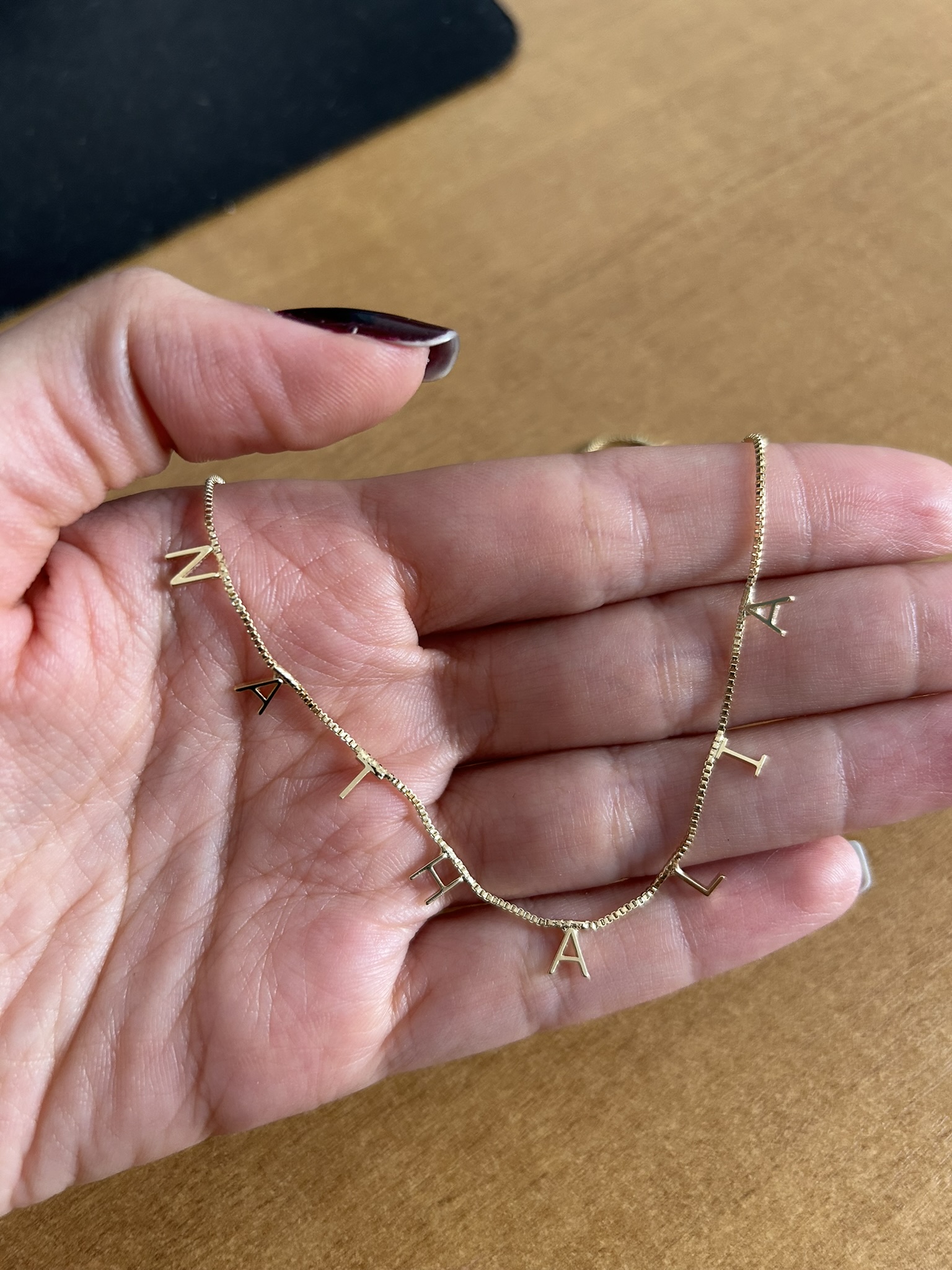 Colar nome personalizado pendurado. Na corrente veneziana. Banhado a ouro 18k.