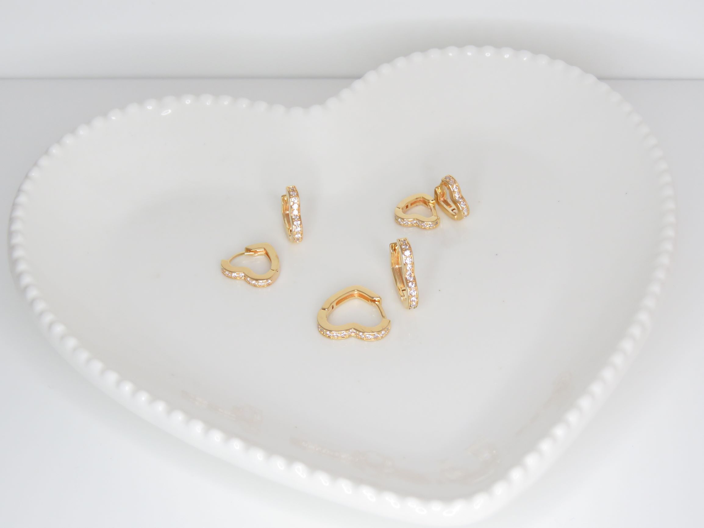 Brinco de argola em formato de coração cravejado na zircônia. Disponível em três tamanhos. Fechamento em click. Banhado a ouro 18k.