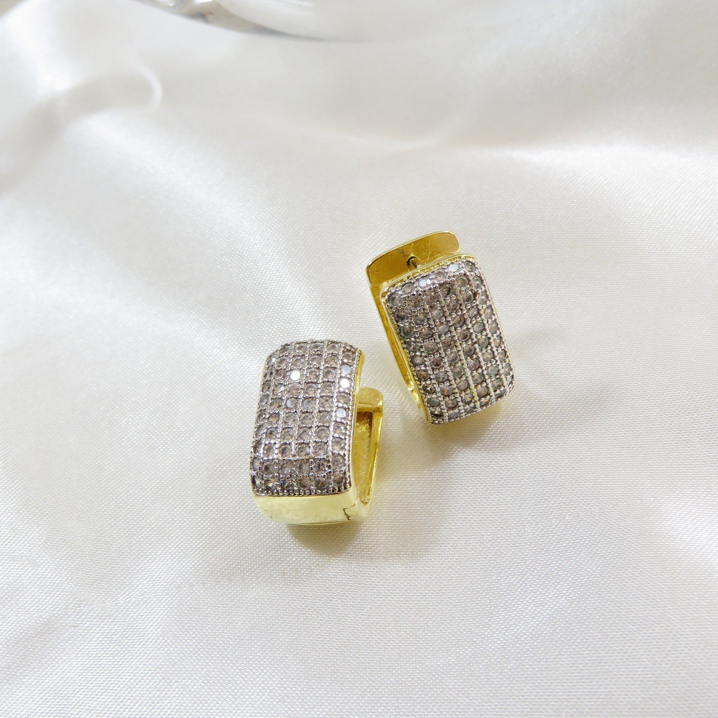 Brinco de argola em formato quadrado, cravejada na zircônia. Fechamento em click. Banhado a ouro 18k.