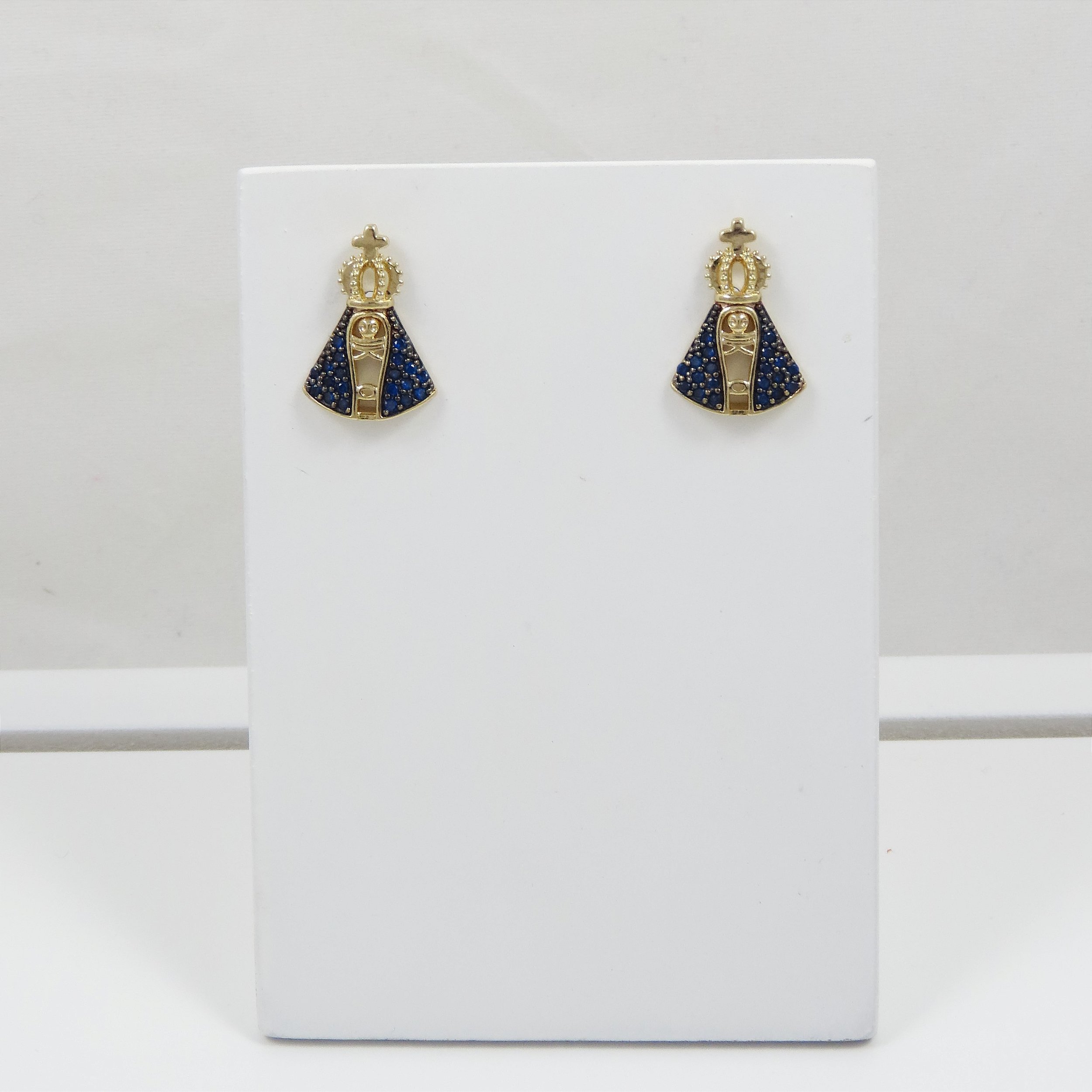 Brinco de Nossa Senhora cravejada na zircônia azul e ródio. Fechamento em tarracha. Banhado a ouro 18k.