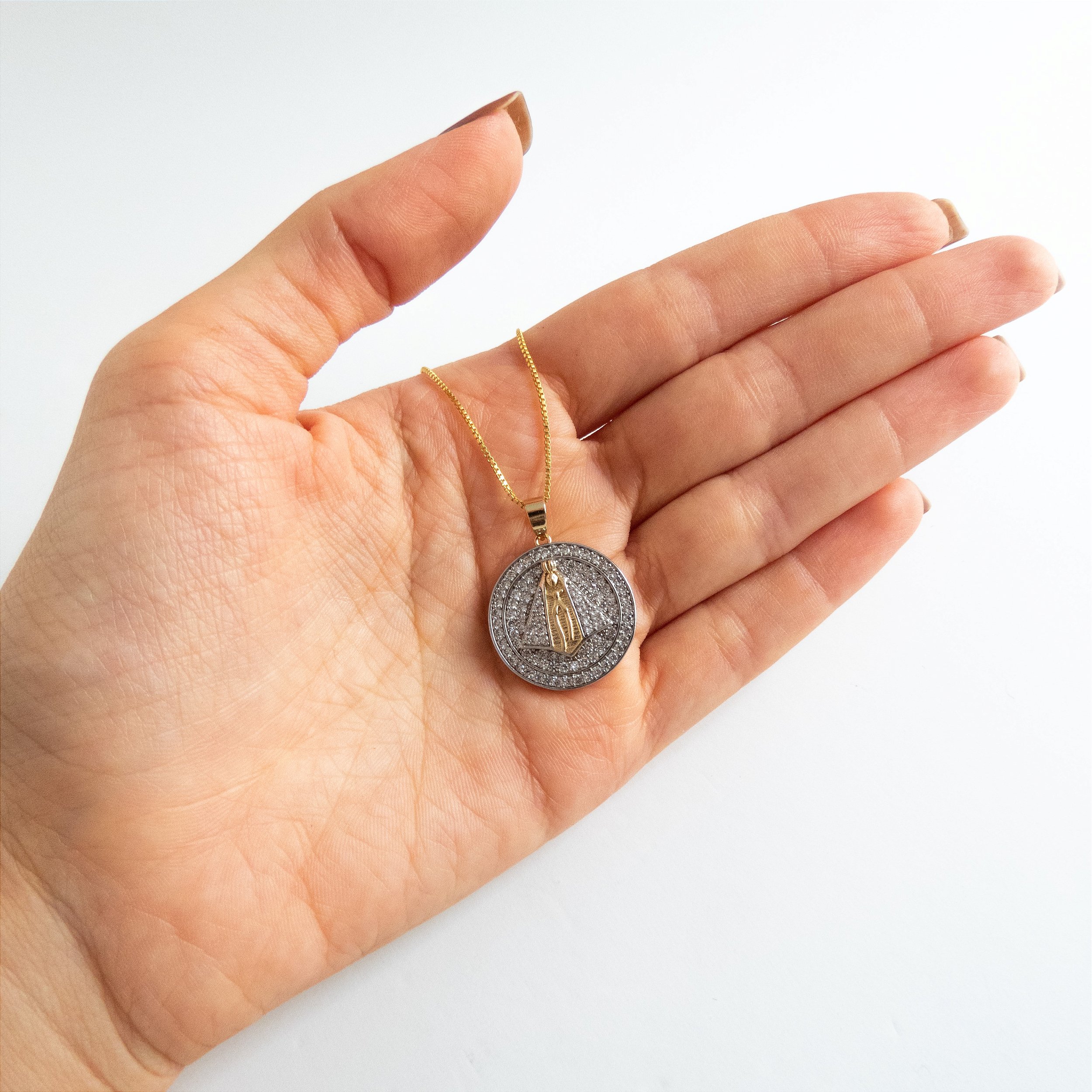 Colar medalha Nossa Senhora Aparecida todo cravejado na zircônia e com detalhes no ródio branco. Na corrente veneziana. Banhado a ouro 18k.