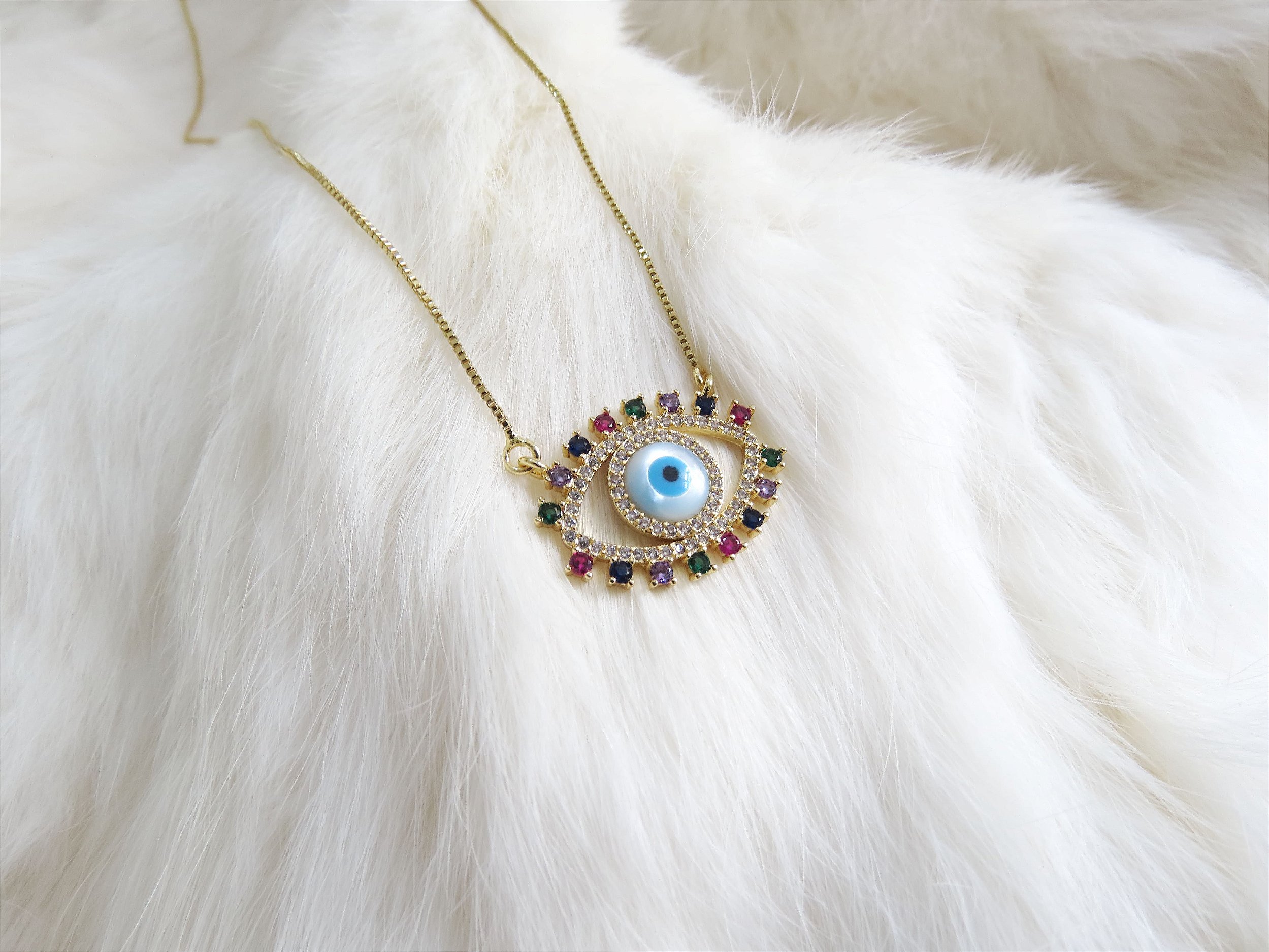 Cordão de olho grego na madrepérola com pedras coloridas em volta e cravejado na zircônia. Na corrente veneziana. Banhado a ouro 18k.