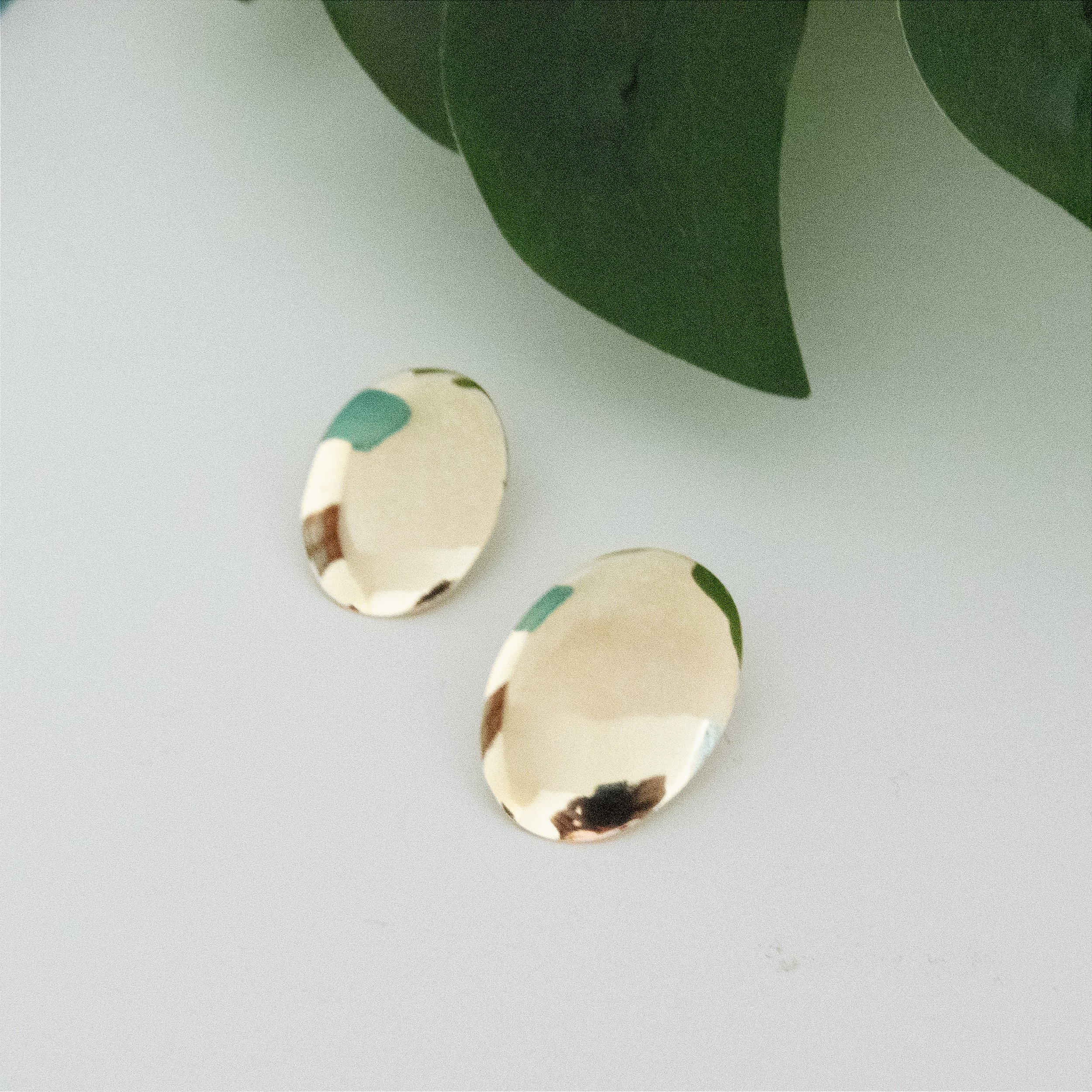 Brinco tipo botão em formato oval. Fechamento em tarracha. Banhado a ouro 18k.